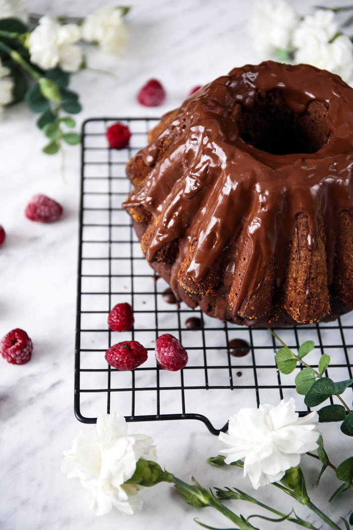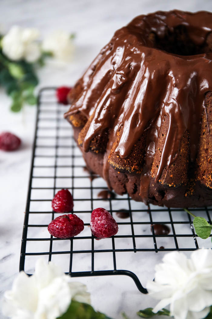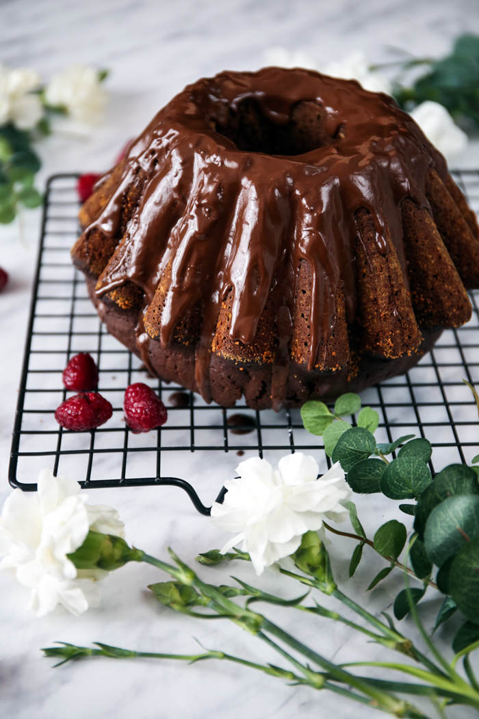 Czekolady rozpuścić z masłem i wodą w kąpieli wodnej. Udekorować babkę.