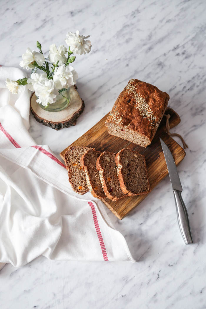 Wszystkie składniki dokładnie wymieszać łyżką w dużej misce (morele i orzechy pokroić w mniejsze kawałki). Miskę przykryć ręcznikiem kuchenny, odstawić w ciepłe miejsce do wyrośnięcia na ok. 90 minut, do czasu aż ciasto podwoi objętość. Po tym czasie przełożyć do keksówki wyłożonej papierem do pieczenia i odstawić w ciepłe miejsce na kolejne 30 minut. Piec w piekarniku rozgrzanym do 180 C – termoobieg przez 80 minut (przed pieczeniem można udekorować wierzch chleba sezamem). Kroić po całkowitym ostygnięciu.