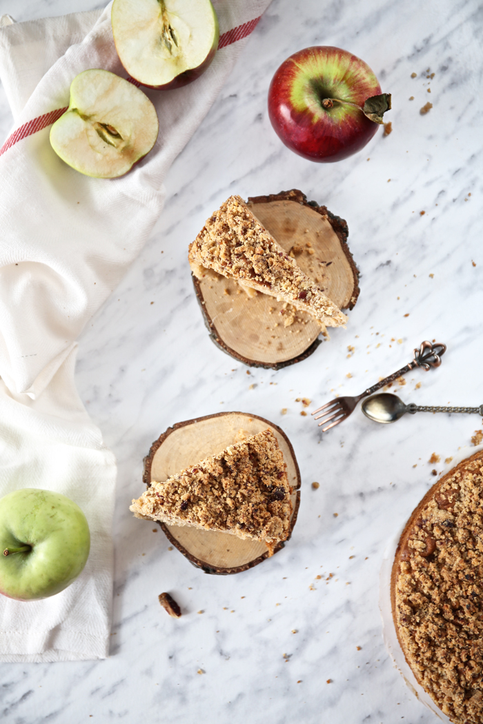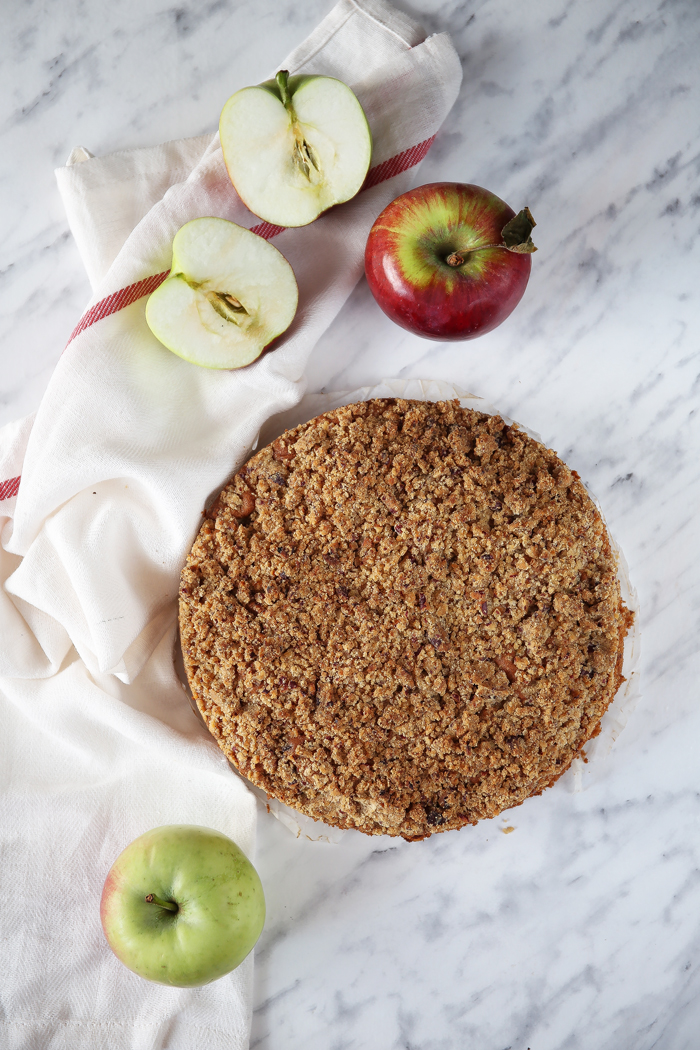 Bardzo prosty torcik z jabłkami zyskuje zupełnie nowe oblicze dzięki dodatkowi orzechowej kruszonki. Obowiązkowy punkt jabłkowego sezonu. Polecam!