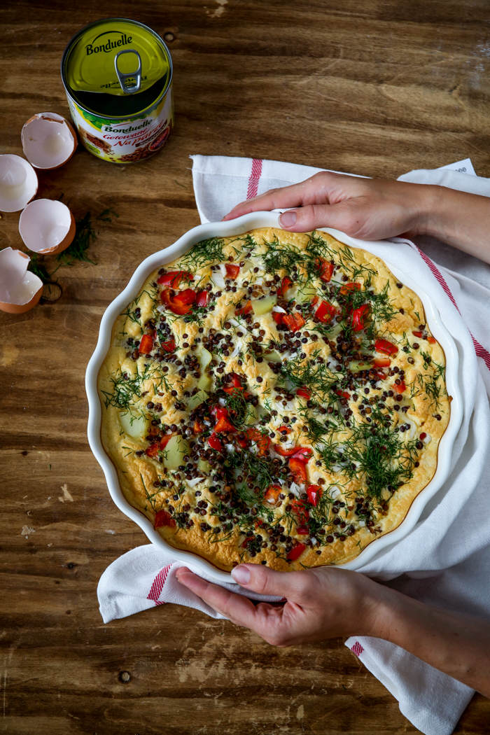 Fritatta to niezwykle proste, ale także bardzo zaskakujące danie, które możecie przygotować na wiele sposobów : ) Swoją formą przypomina omleta zapiekanego w piekarniku. Uwielbiamy jeść ją na ciepło w ramach błyskawicznego obiadu, ale sprawdzi się również jako zimna przekąska na imprezę lub kolację.  Dziś przedstawiam Wam przepis na kolorową wersję z dodatkiem pysznych warzyw: papryki, młodych ziemniaków, cebuli oraz gotowanej na parze soczewicy od marki Bonduelle, która świętuje właśnie w Polsce swoje 25-lecie : ) Jako ciekawostkę zdradzę Wam, że wszystkie warzywa Bonduelle od samego nasiona aż do gotowego produktu posiadają nadzór agronomów, którzy czuwają nad ich jakością. Połączenie ziemniaków z soczewicą sprawia, że fritatta jest bardzo treściwa, a wraz z pozostałymi składnikami całość komponuje się w pyszne i zdrowe danie, bogate w substancje odżywcze. Zapewniam, że te niepozorne trójkąty zawsze znikają zbyt szybko : ) Polecam!!!