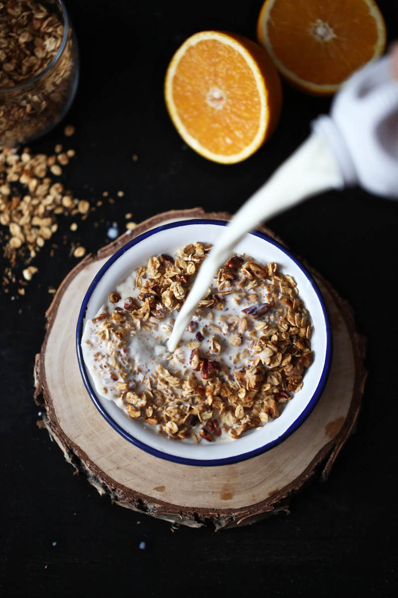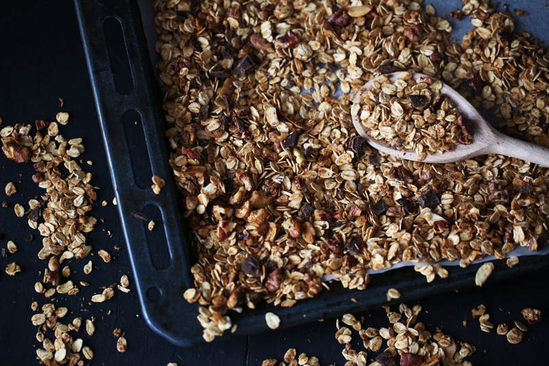 Domową granolę uwielbiam chyba w każdej odsłonie! : ) Idealnie sprawdza się w roli przekąski lub drugiego śniadania w połączeniu z mlekiem, kefirem lub naturalnym jogurtem. W wersji jesiennej obowiązkowo z dużą ilością orzechów oraz syropem klonowym, z którym ostatnio się nie rozstaję ; ) Polecam!!!