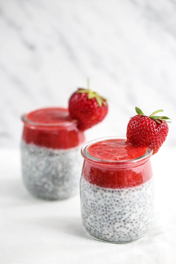 Mleko wymieszać z nasionkami chia i wiórkami kokosowymi. Przelać do mniejszych szklaneczek i odstawić na noc do lodówki. Kiedy pudding stężeje, na wierzchu dodać zmiksowane blenderem truskawki.