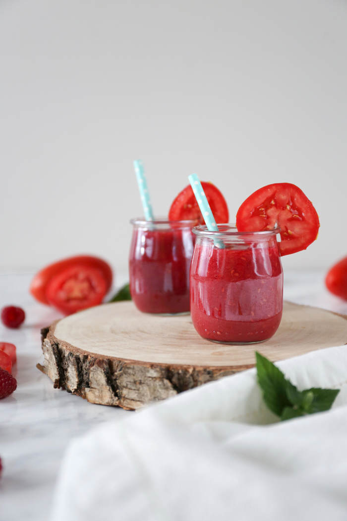 Pomidory to jedne z moich ulubionych warzyw, ale nigdy nie byłam wielką miłośniczką pomidorowego soku… Dopiero połączenie go z malinami i miętą okazało się strzałem w dziesiątkę i ten warzywno – owocowy koktajl stał się hitem naszej kuchni. Pysznie i zdrowo, polecam!