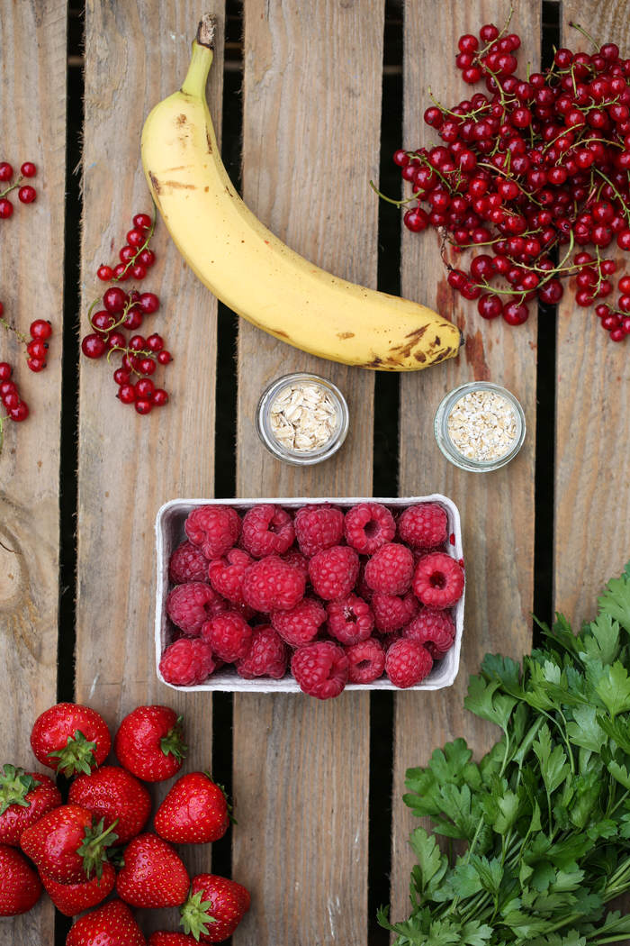 Truskawki umyć i usunąć szypułki. Dodać delikatnie opłukane maliny, opłukane i obrane z gałązek porzeczki, obranego banana, garść listków natki pietruszki oraz płatki i otręby owsiane. Całość dokładnie zmiksować blenderem do uzyskania konsystencji jednolitego koktajlu. Przelać do szklanek i podawać od razu.