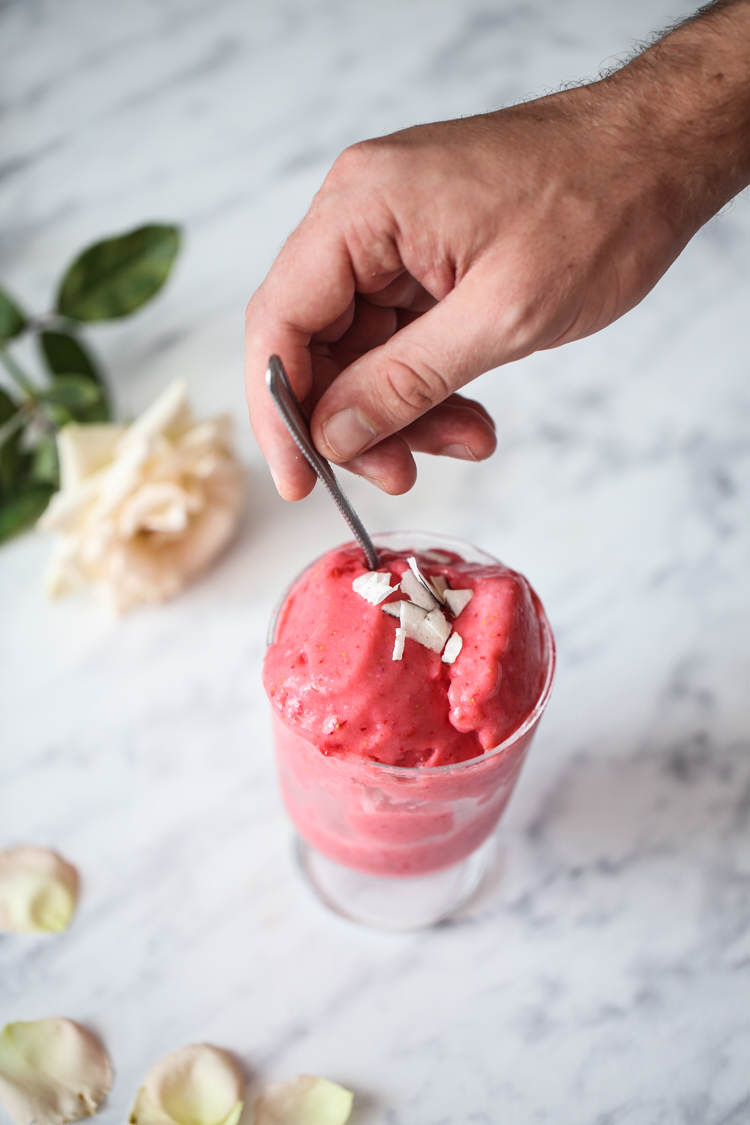 Kalafior i truskawki zmiksować blenderem. Stopniowo dodawać mleko kokosowe, dalej miksując do uzyskania pożądanej konsystencji.
