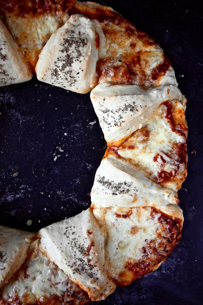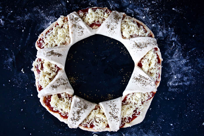 Wyrośnięte ciasto rozwałkować na kształt koła o średnicy 30 cm. Na środku ciasta zrobić zarys mniejszego okręgu i pokroić go na 8 części. Nie pokrojoną część pizzy posmarować sosem pomidorowym ułożyć starty ser mozzarella i opcjonalnie inne dodatki. Trójkąty ze środka założyć pod brzeg ciasta i dokładnie zlepić. Wierzch posypać bazylią (można również posmarować mlekiem wtedy ciasto ładnie się zarumieni). Odstawić na kolejne 10 minut, a następnie piec w piekarniku rozgrzanym do 220 C (termoobieg) przez ok. 10-15 minut.