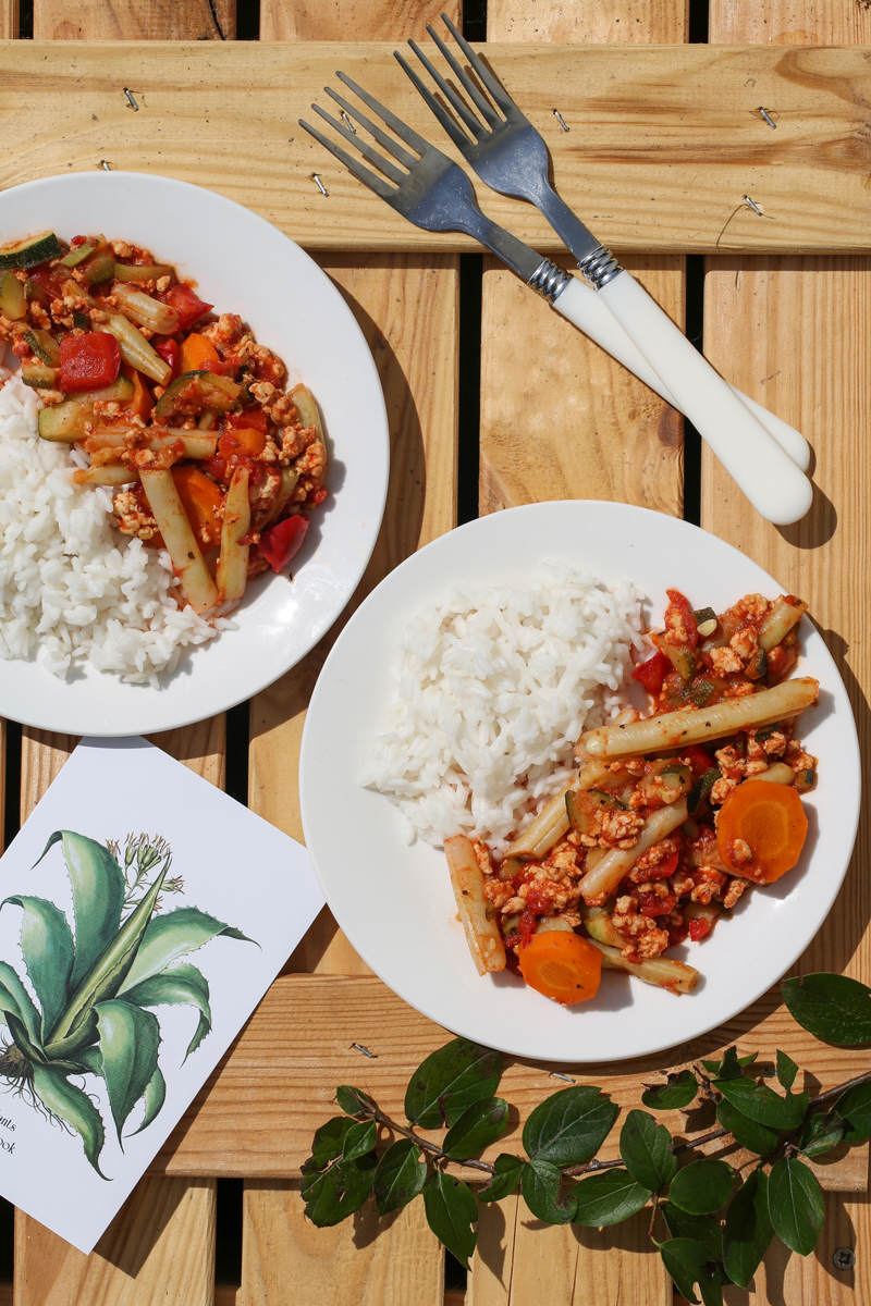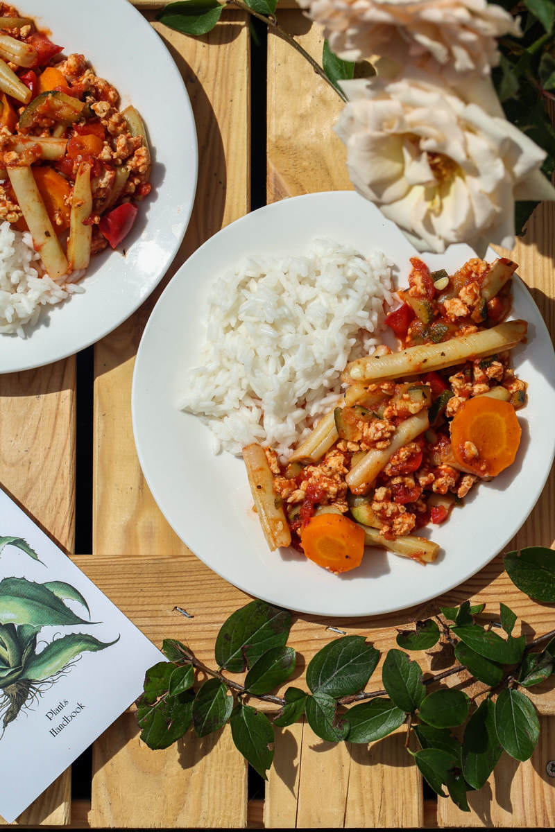 Fasolkę szparagową i marchewkę pokrojoną w talarki ugotować na parze. Mięso z indyka doprawić pieprzem oraz curry i podsmażyć na jednej łyżce oleju. Dodać pokrojoną w kostkę cukinię oraz paprykę i podsmażać przez kilka minut razem, co jakiś czas mieszając. Dodać pomidory z puszki, dusić na średnim ogniu pod przykryciem przez ok. 15 minut. Doprawić do smaku, przełożyć ugotowaną fasolkę oraz marchewkę. Wymieszać.