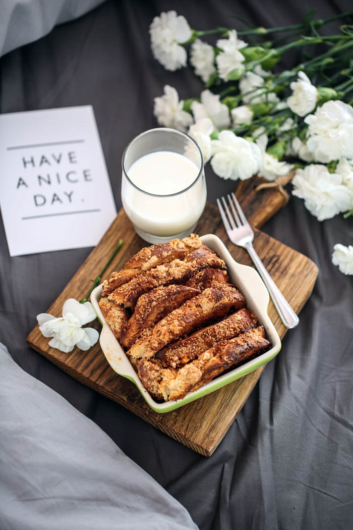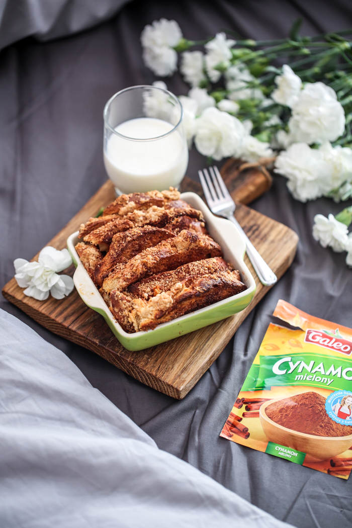 Bardzo rzadko zdarzają nam się dni, kiedy świeżo upieczona chałka nie zostaje zjedzona jeszcze lekko ciepła : ) Jeśli jednak uda się jej dotrwać kolejnych dni (przyznam się, że często w tym celu piekę od razu z podwójnej porcji ; ) ) nie ma nic lepszego niż przygotowanie chlebowego puddingu, czyli zapiekanych tostów cynamonowych : ) Są obłędne i trudno im się oprzeć, a cały dom na długo wypełnia cudowny zapach cynamonu. Mały powrót do beztroskiego dzieciństwa : ) Polecam!!!