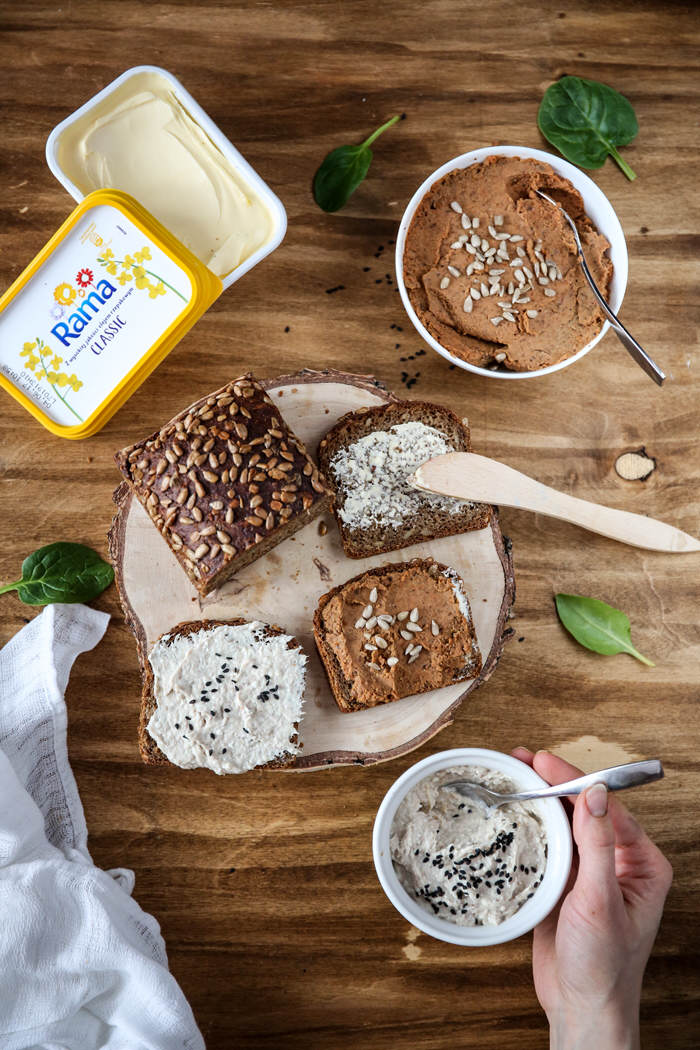 Pieczywo posmarować Ramą, która jest cennym źródłem witamim E, A i D. Makrelę, twaróg i jogurt naturalny zmiksować na gładką pastę. W razie potrzeby doprawić solą i pieprzem. Pastę przełożyć na kanapki, posypać czarnym sezamem.