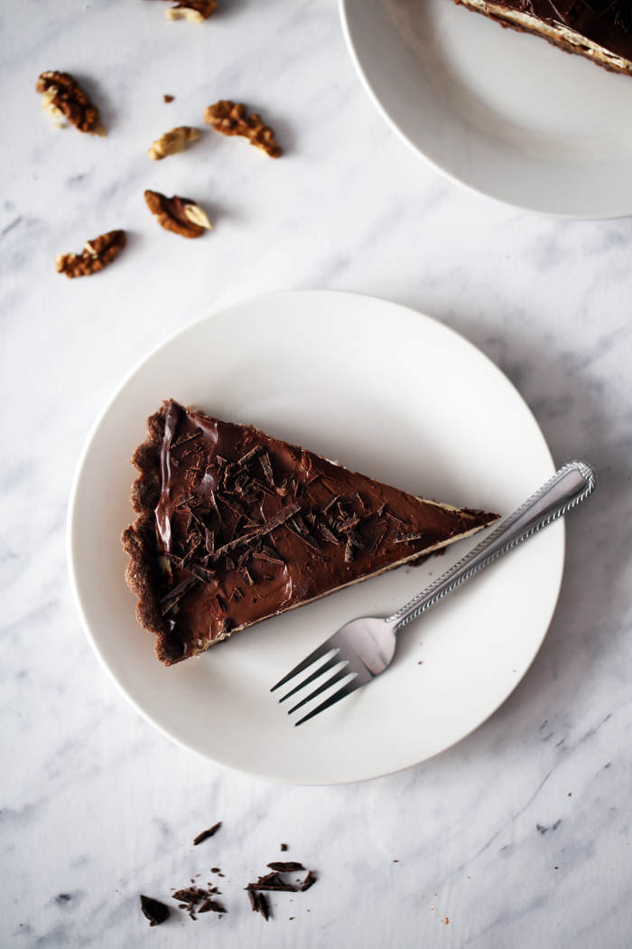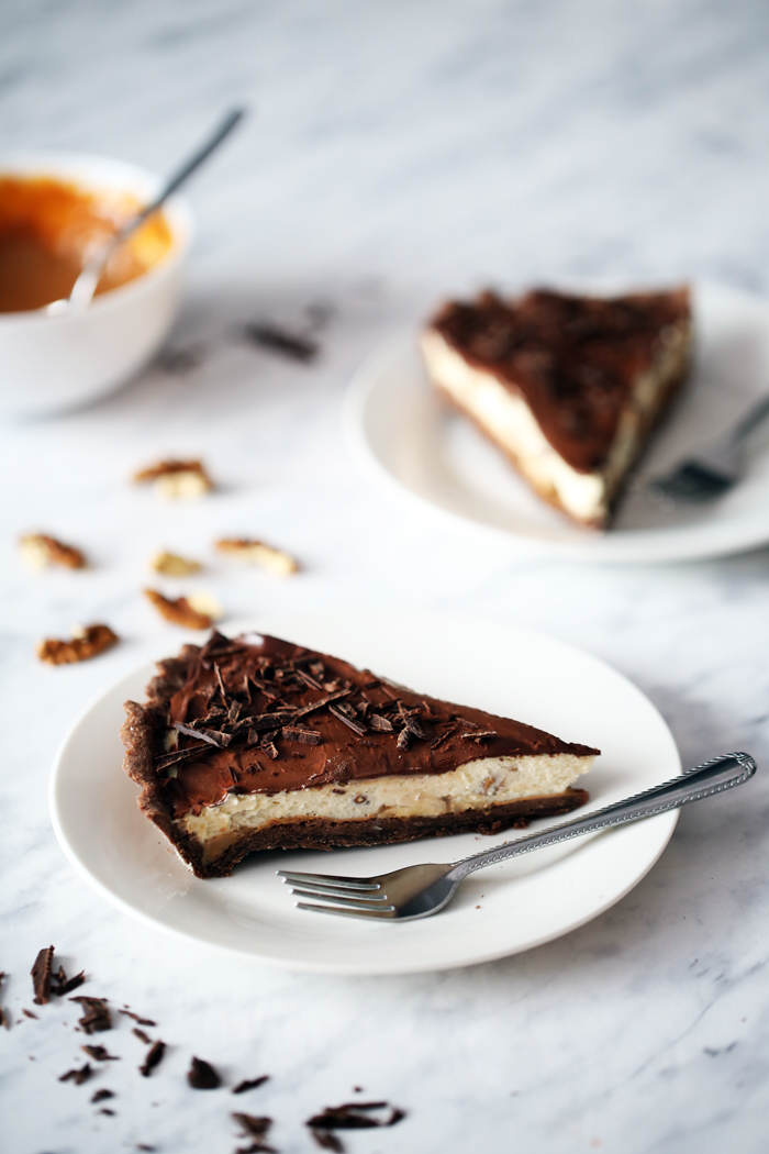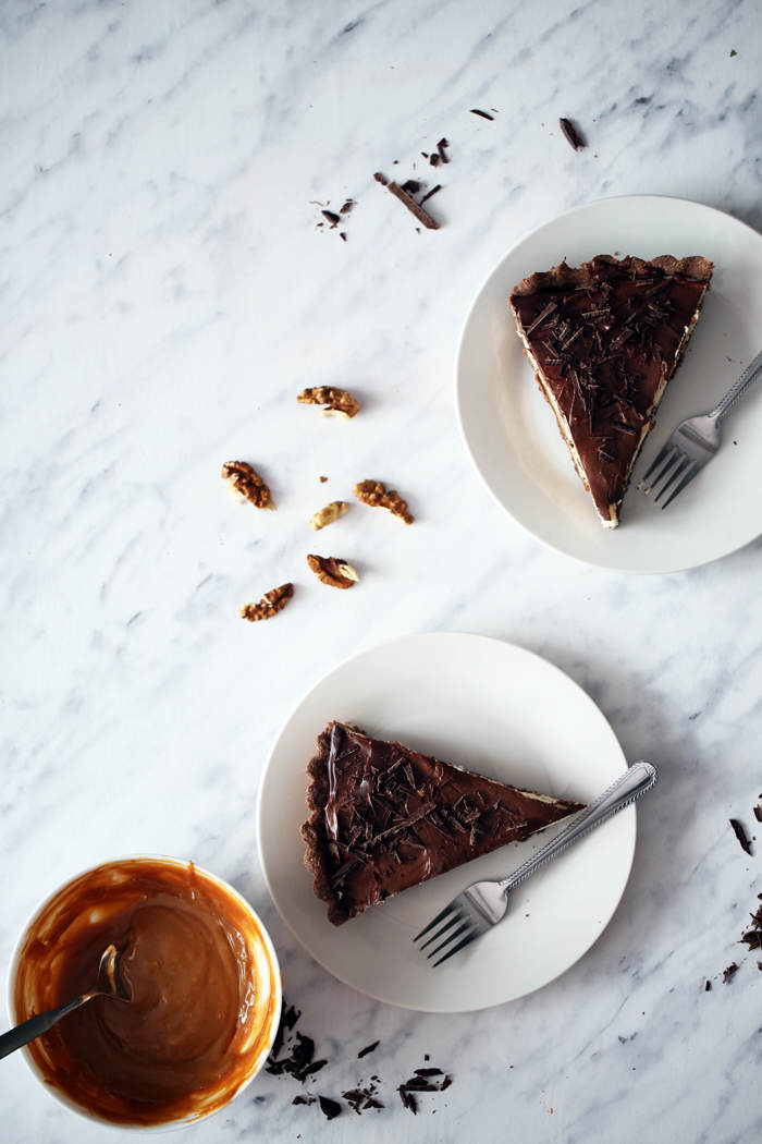 Po przygotowaniu jednego z Waszych blogowych ulubieńców – tortu dacquoise zostało mi trochę składników, które nie mogły się zmarnować : ) Tarta z kajmakiem i mascarpone to świetny sposób na ich wykorzystanie i kolejny przepis, który potwierdza, że także jesienne wypieki bez świeżych owoców mogą być pyszne : ) Słodycz kajmaku przełamałam orzechami, a puszysty krem z mascarpone i kremówki został pokryty polewą z wytrawnej gorzkiej czekolady. Całość komponuje się idealnie i gwarantuję, że trudno będzie poprzestać na jednym kawałku : ) Polecam !!!
