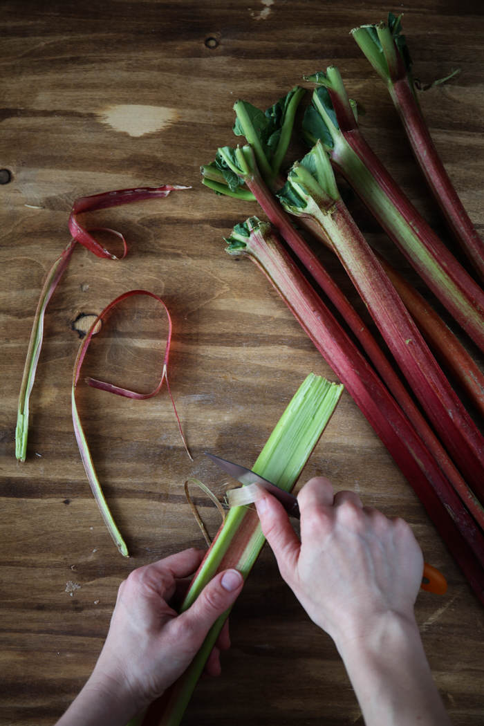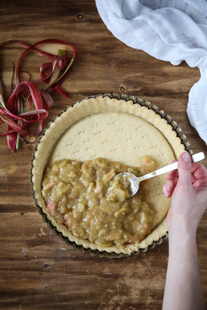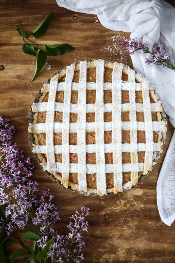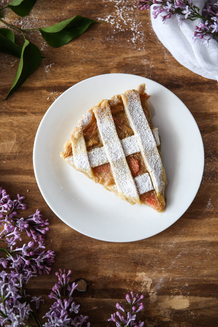 Rabarbar umyć, obrać, pokroić na mniejsze kawałki. Dodać cukier i prażyć na małym ogniu do czasu aż zmięknie i puści sok (ok. 5 minut). Mąkę ziemniaczaną wymieszać z wodą dodać do rabarbaru i wymieszać, aż zgęstnieje. Przestudzić. Wyłożyć na schłodzony spód tarty, pozostałe ciasto rozwałkować, wyciąć paski i ułożyć na wierzchu kratkę. Ponownie przełożyć do rozgrzanego do 170 C (termoobieg) piekarnika i piec ok. 20 minut. Przed podaniem udekorować cukrem pudrem.