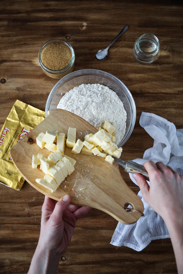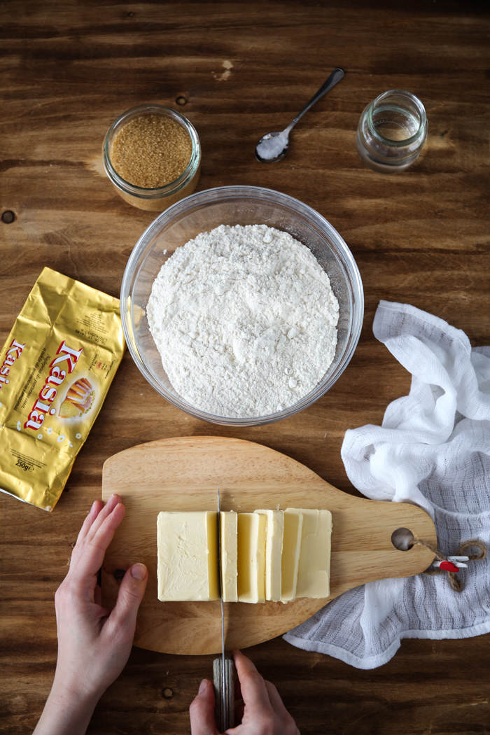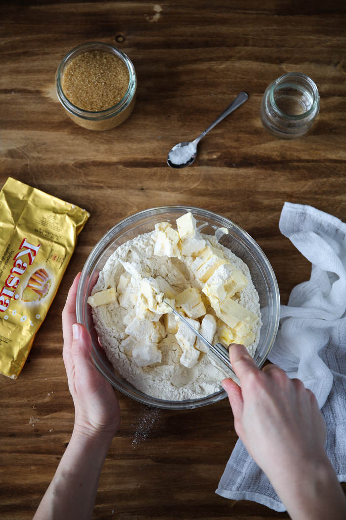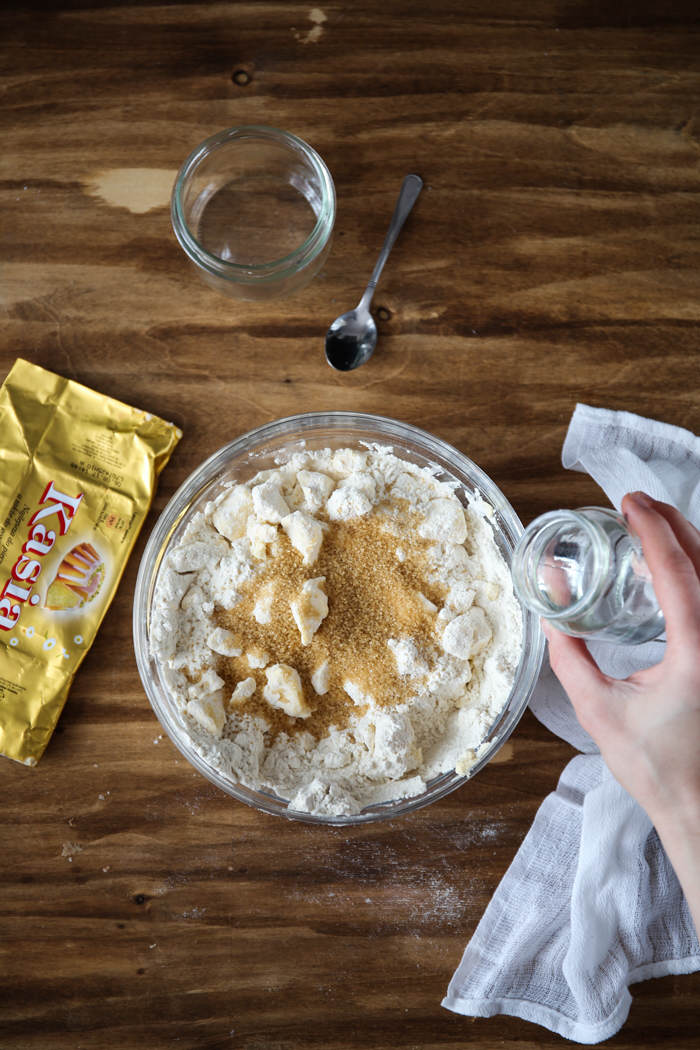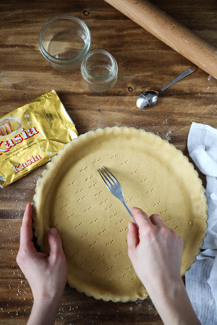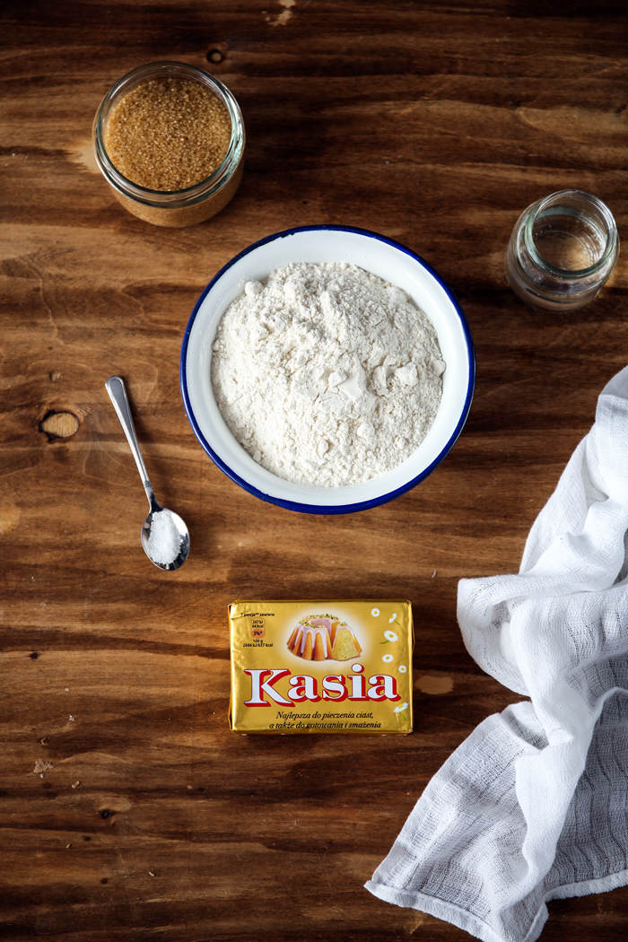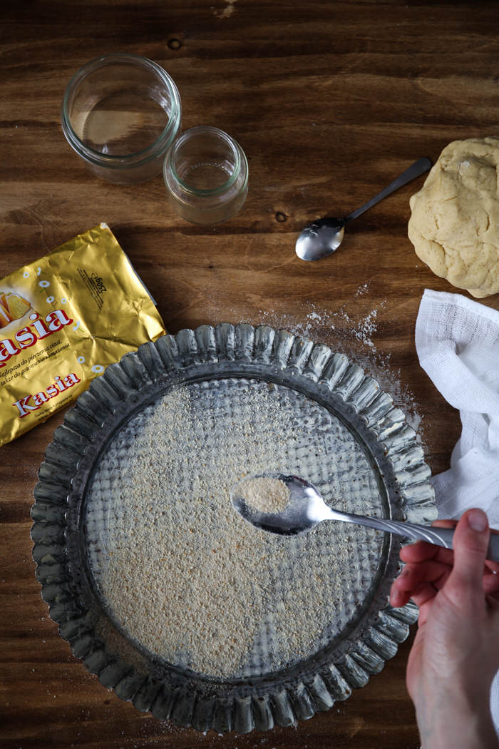 Masło pokroić na mniejsze kawałki, posiekać z mąką, dodać cukier trzcinowy, szczyptę soli i wodę. Szybko zagnieść ciasto (można użyć robota kuchennego, aby ciasto nie przejęło ciepła z naszych rąk). Podzielić na dwie części (w proporcji 2:1). Większą z nich rozwałkować i przełożyć do formy na tartę wysmarowanej kostką do pieczenia i wysypanej bułką tartą. Schłodzić w lodówce przez co najmniej 30 minut, po tym czasie przełożyć do piekarnika rozgrzanego do 170 C (termoobieg) i piec przez ok. 15 minut do czasu aż ciasto nabierze złotego koloru.