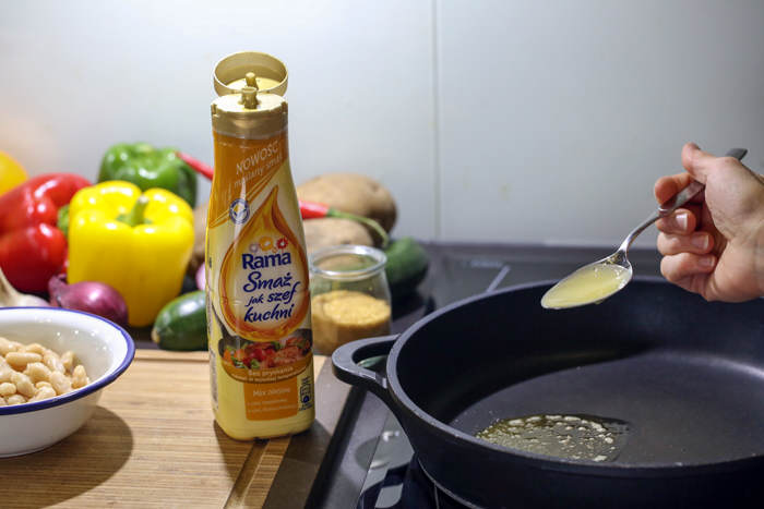 1. Ramę Smaż jak szef kuchni wlać na rozgrzaną patelnię. Kiedy znikną bąbelki to znak, że osiągnięta została idealna do smażenia temperatura. Rama Smaż jak szef kuchni jest idealna do smażenia, ponieważ świetnie wydobywa smak smażonych potraw i nie pryska.