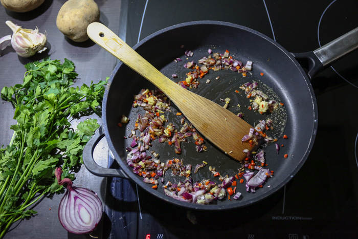1. Dodać pokrojoną w małą kostkę cebulę, chilli oraz przeciśnięty przez praskę czosnek i podsmażać razem przez około 2 – 3 minuty.