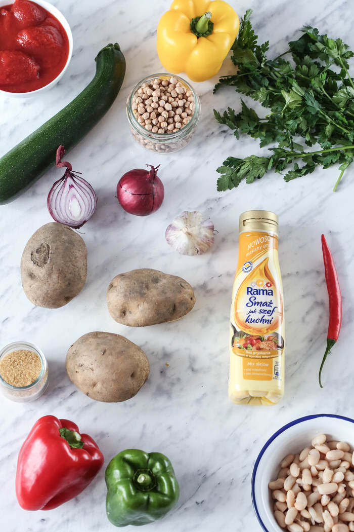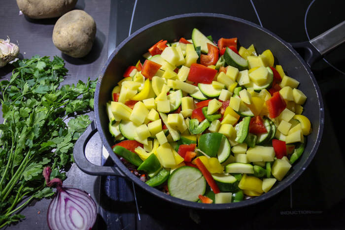 1. Papryki oraz obrane ziemniaki pokroić w kostkę, cukinię w półplasterki. Warzywa przełożyć na patelnię, przemieszać. Całość zalać ½ szklanki wody (w razie potrzeby dolać więcej) i dusić pod przykryciem przez ok 10 minut, do czasu aż ziemniaki zmiękną.
