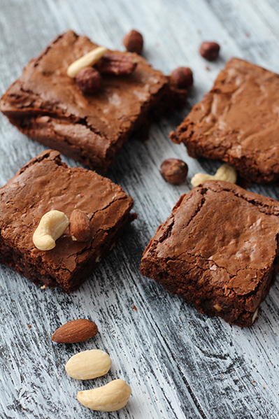 Czekoladę i masło rozpuścić w kąpieli wodnej. Orzechy pokroić na mniejsze kawałki i dodać wraz z pozostałymi składnikami do czekoladowej masy. Dokładnie zmiksować. Przełożyć na blachę wyłożoną papierem do pieczenia i piec w rozgrzanym do 180 C piekarniku przez 35 minut.