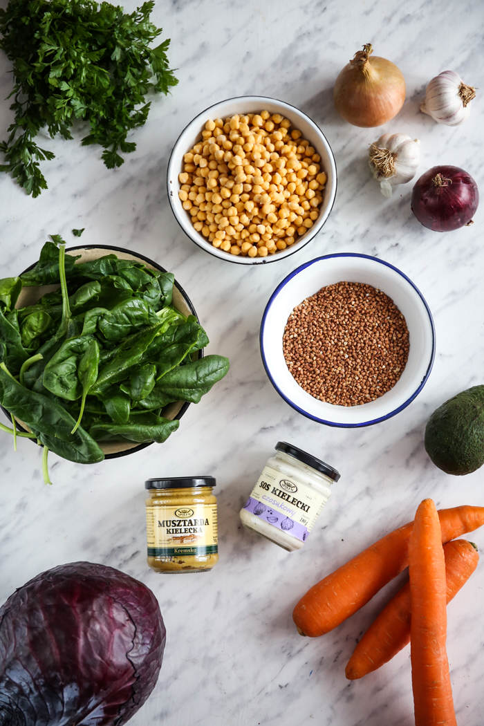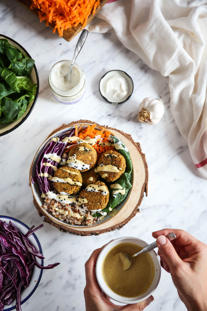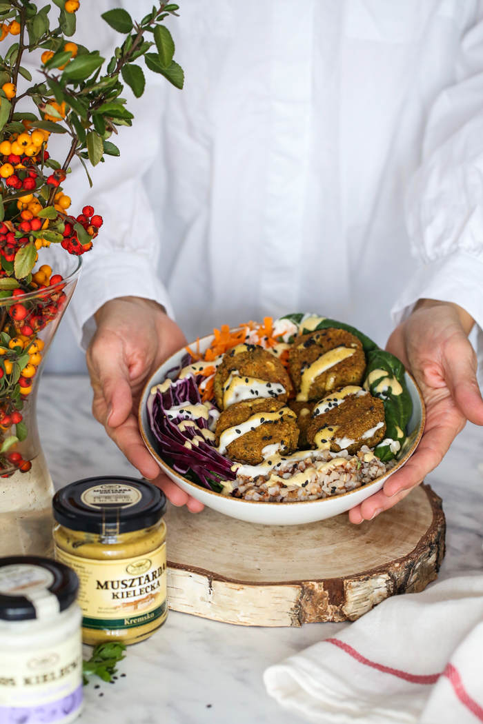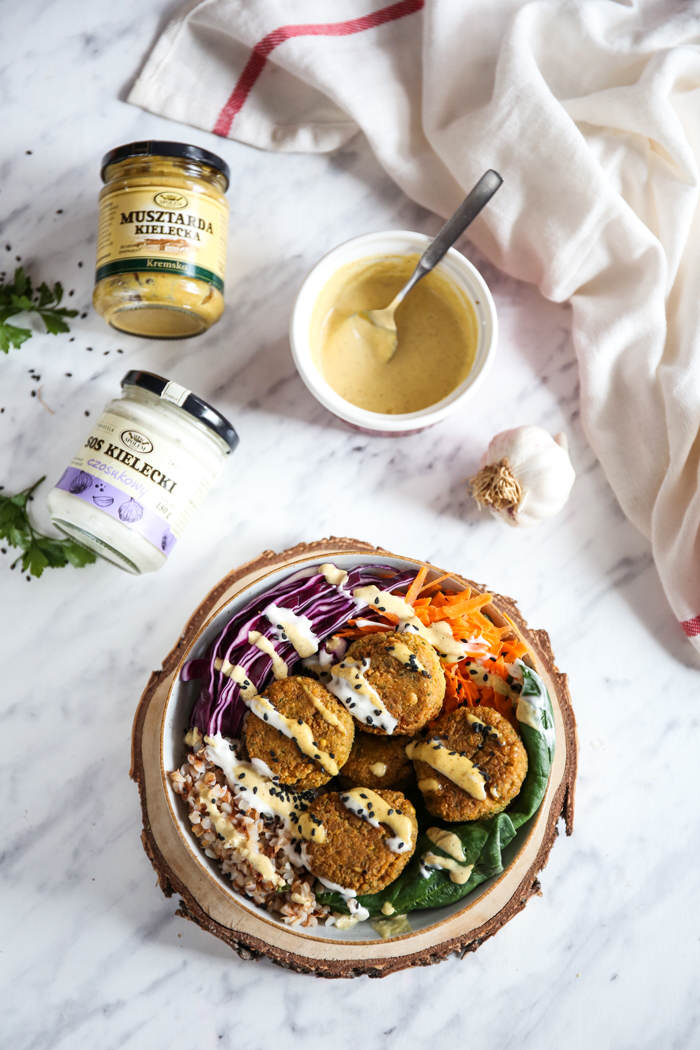Kaszę ugotować zgodnie z instrukcją podaną na opakowaniu. W miseczce ułożyć szpinak, poszatkowaną kapustę, ugotowaną kaszę, marchewkę startą na dużych oczkach tarki oraz usmażone falafele. Polać sosem czosnkowym i musztardowym, udekorować czarnym sezamem.