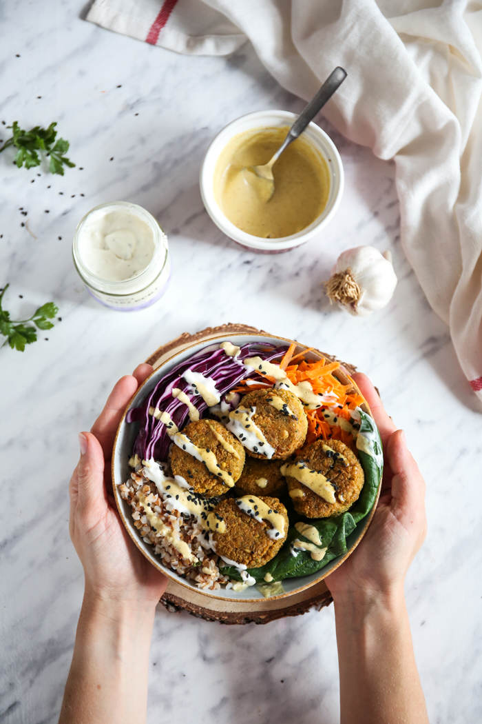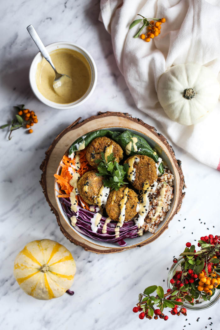 Buddha bowls, które podbijają ostatnio internet, to bogato napełnione miseczki bazujące na kolorowych, roślinnych przysmakach. Uwielbiam je za prostotę przygotowania i duże pole do popisu przy komponowaniu ich zgodnie z naszymi upodobaniami smakowymi. Nie bez powodu nazywane są miseczkami rozmaitości, bo poza podstawowymi składnikami dużą rolę odgrywają sosy i dressingi, które mogą jeszcze bardziej zmienić oblicze naszego dania. Wersja z falafelem stanowi nie tylko pyszny, ale również bardzo pożywny posiłek, który nasyci nas na długi czas. Polecam!