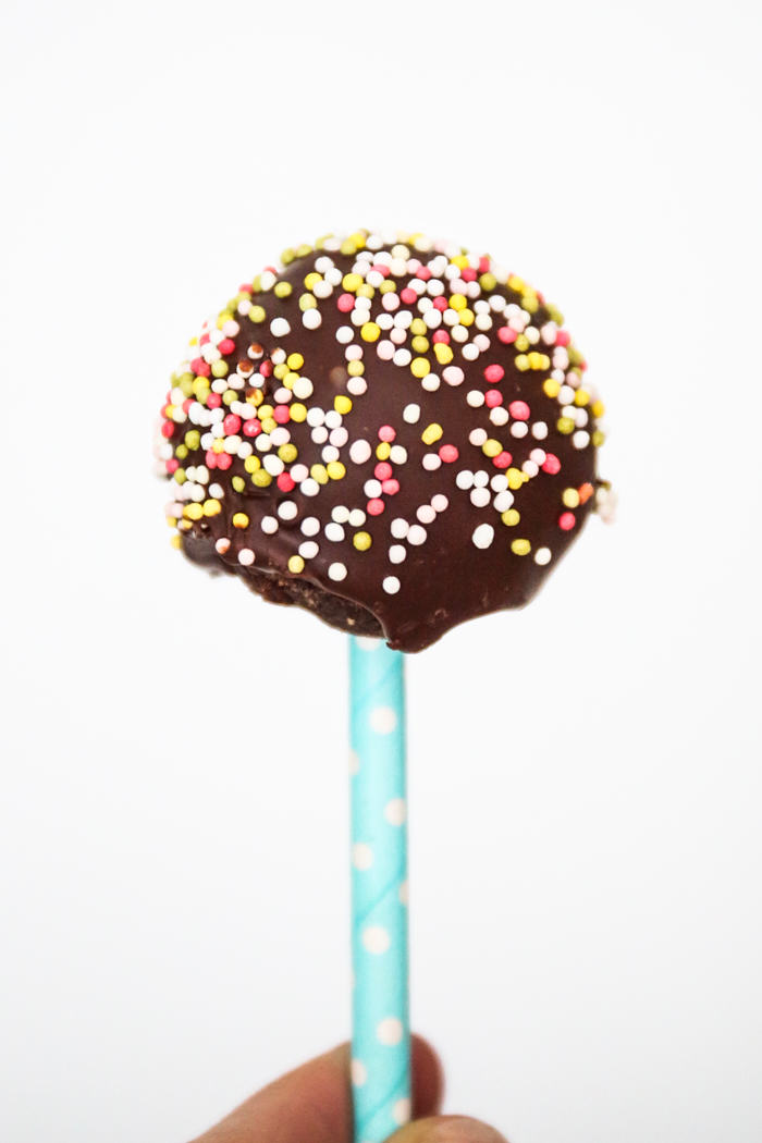Czekoladę rozpuścić z olejem w miseczce ustawionej nad garnkiem z parującą gorącą wodą (miseczka nie może dotykać powierzchni wody). Schłodzone Cake Popsy zanurzać w roztopionej czekoladzie, odczekać chwilę, aż jej nadmiar spłynie. Udekorować posypką. Ułożyć delikatnie na papierze do pieczenia lub wbić patyczki w styropian. Przechowywać w lodówce.