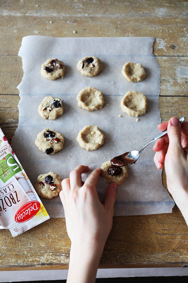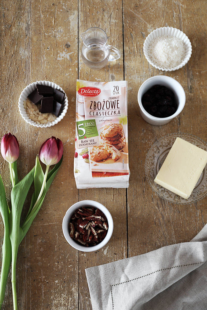 Zawartość opakowania „Zbożowe Ciasteczka” miksuję z posiekanym masłem, 3 łyżkami wody oraz sokiem z cytryny.  Ciasto dzielę na dwie części. Do pierwszej połowy dodaję suszoną żurawinę, posiekane orzechy, wiórki kokosowe. Ponowie szybko miksuję. Z ciasta formuję kuleczki, po czym spłaszczam dłonią i przekładam na blachę wyłożoną papierem do pieczenia. Z drugiej części ciasta również formuję kuleczki, spłaszczam je dłonią, zostawiając w środku małe wgłębienie, do którego przekładam czekoladę rozpuszczoną w kąpieli wodnej. Piekę w piekarniku rozgrzanym do 180 C (opcja grzania góra- dół) przez ok. 20-25 minut, do czasu aż będą złociste. Studzę na kratce i pakuję do śniadaniówki ; )