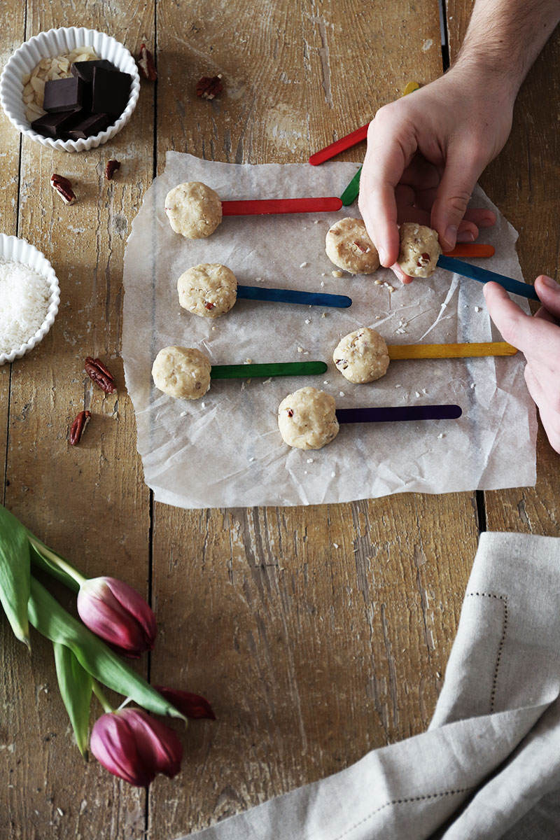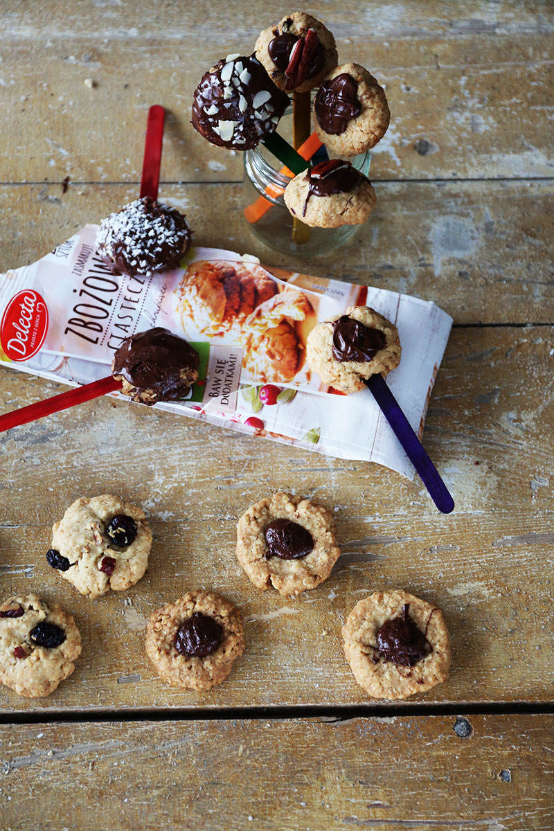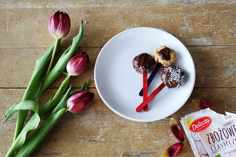 Do misy miksera przesypuję zawartość opakowania „Zbożowe Ciasteczka”, posiekane masło oraz 3 łyżki wody. Szybko zagniatam ciasto (można to zrobić również ręcznie, ważne, aby zagnieść je szybko, tylko do połączenia się składników). Dodaję wiórki kokosowe, posiekane orzechy nerkowca i płatki migdałów. Ponowie szybko mieszam. Z ciasta formuję kuleczki, nadziewam na patyczki do lizaków i delikatnie spłaszczam dłonią. Układam na blasze wyłożonej papierem do pieczenia. Przekładam do piekarnika rozgrzanego do 180 C (opcja grzania góra- dół) i piekę ok. 20-25 minut, do czasu aż ładnie się zarumienią. Studzę na blasze i w tym czasie przygotowuję polewę. Czekoladę rozpuszczam w kąpieli wodnej. Wykorzystuję w tym celu zwykły garnek do gotowania na parze ; ) Czekoladę umieszczam w metalowej miseczce nad wrzącą wodą i czekam, aż się rozpuści, dzięki parze wodnej. Na koniec dodaję olej rzepakowy i delikatnie mieszam, aby polewa była błyszcząca. Tak przygotowaną polewą dekoruję przestudzone ciasteczkowe lizaki. Część z nich obtaczam dodatkowo w wiórkach kokosowych, do części dodaję płatki migdałowe lub orzechy np. pekan. Pakuję do puszki/pojemnika i rozkoszuję się pysznym śniadaniem w pracy ; )