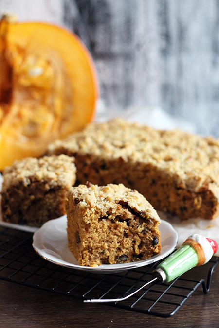 Dzięki uprzejmości mojej koleżanki Ewy i jej mamy, sezon na dynię trwa u mnie nadal – dziękuję : ) Jak wiecie wolę ją zdecydowanie w wypiekach niż wytrawnych daniach i tym razem postawiłam na dyniowe ciasto z kruszonką. Ciasto jest mocno aromatyczne z wyraźnym posmakiem orzechów. Przepis podejrzany w Smakach życia, z moimi modyfikacjami. Pamiętajcie, aby przed pieczeniem składniki były w temp. pokojowej : ) Polecam!