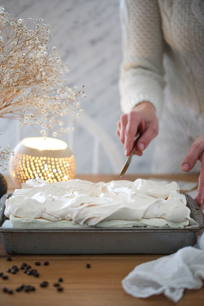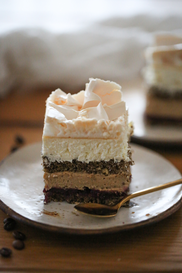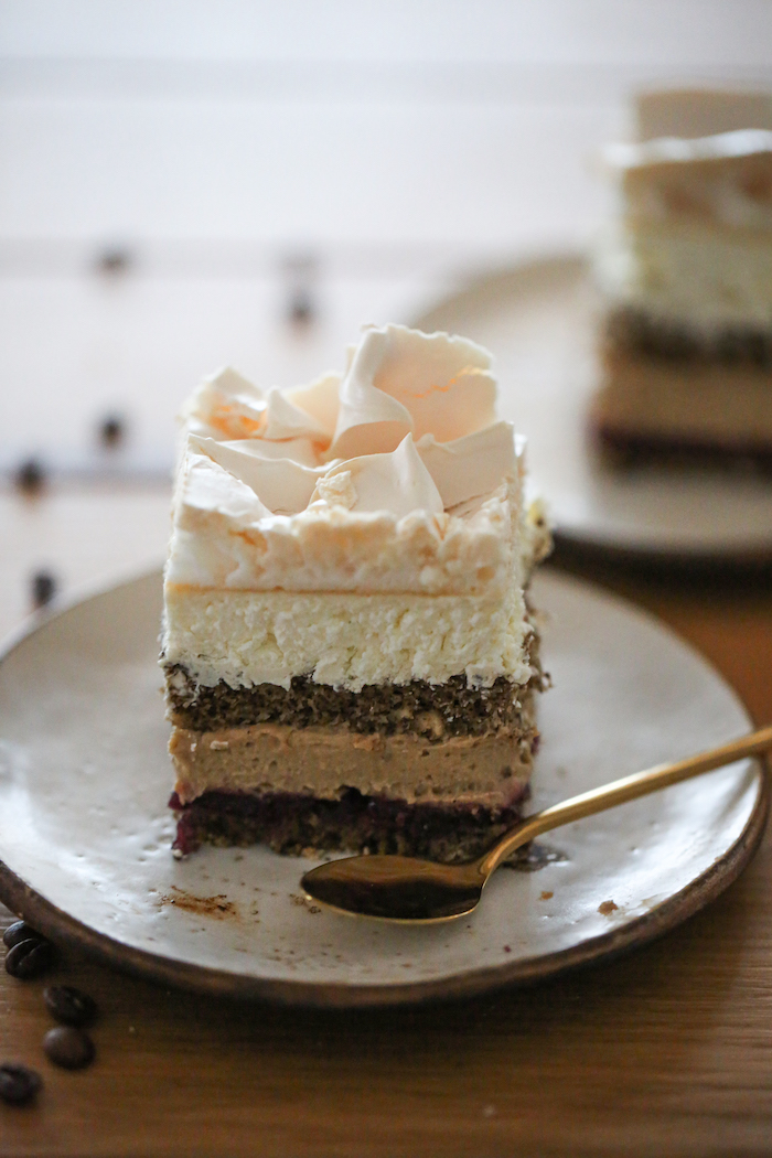 Ciasto Kawowa Chmurka to prawdziwa gratka dla wszystkich kawoszy. Kawowy biszkopt w towarzystwie intensywnego kawowego kremu, lekkiej śmietankowej masy pod delikatną bezą, a całość przełamana kwaskowym smakiem czarnej porzeczki. Ciasto smakuje wyśmienicie i świetnie sprawdzi się jako ozdoba na świątecznym stole.