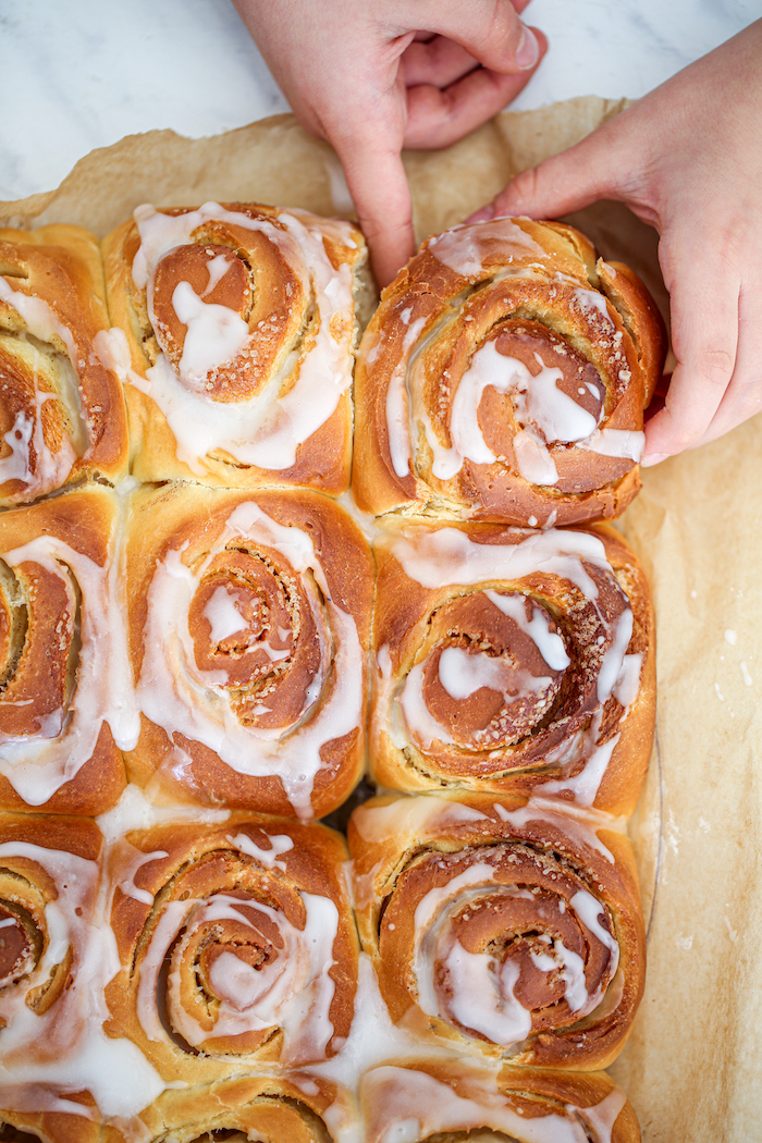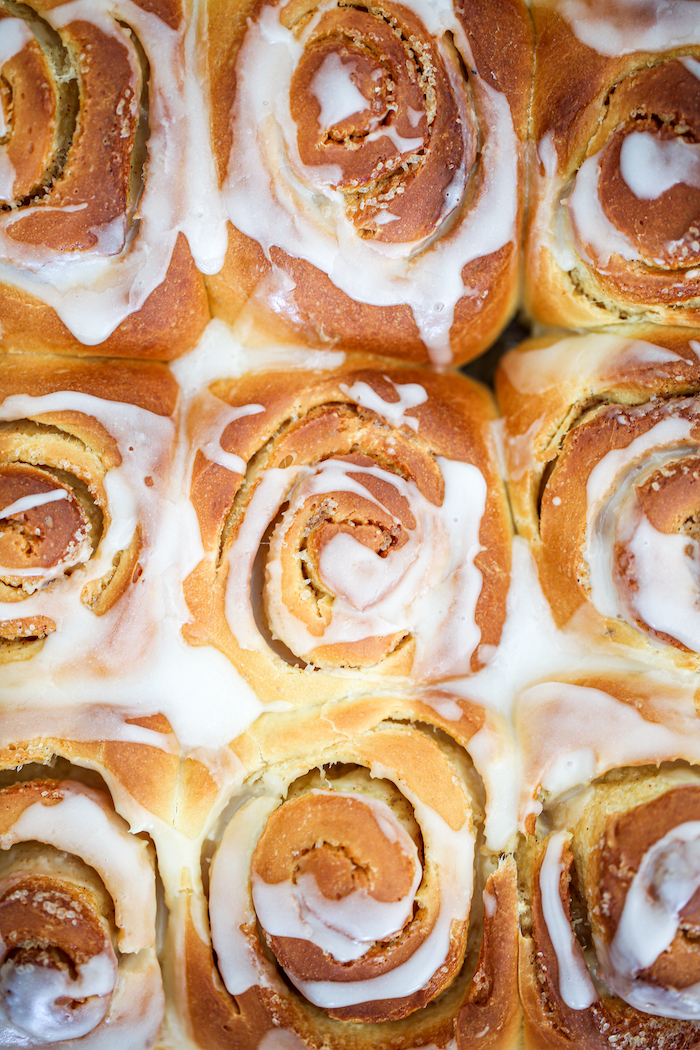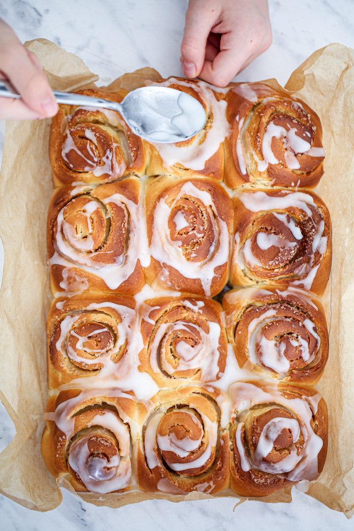 Wszystkie składniki ciasta poza masłem wymieszać przy użyciu robota kuchennego. Dodać masło pokrojone w kawałki, zagniatać przez ok 7-10 minut do czasu, aż ciasto będzie gładkie i elastyczne. Misę z ciastem przykryć ręcznikiem kuchennym i odstawić w ciepłe miejsce do wyrośnięcia na ok. 60-90 minut. Wyrośnięte ciasto odgazować i rozwałkować na prostokąt o wymiarach mniej więcej 30×70 cm. Na cieście rozsmarować miękkie masło, posypać cukrem trzcinowym wymieszanym z cynamonem. Zwinąć w rulon wzdłuż dłuższego boku. Pokroić na 12 równych części i ułożyć na blasze wyłożonej papierem do pieczenia. Przykryć ręcznikiem kuchennym i odstawić do wyrośnięcia na ok. 20-30 minut. Piec w piekarniku rozgrzanym do 180 C (termoobieg) przez 25 minut, do czasu aż będą bardzo rumiane i dopieczone w środku. Udekorować lukrem.