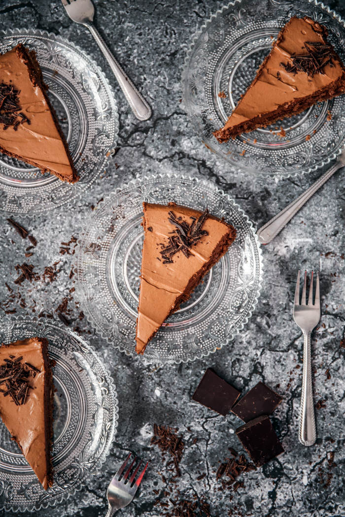 Masło ubić z cukrem na jasną, puszystą masę. Czekoladę rozpuścić w kąpieli wodnej, przestudzić i dodać do ubitego masła wraz z ekstraktem z wanilii. Po dodaniu każdego kolejnego jajka miksować masę na średnich obrotach miksera przez 5 minut. Przełożyć na podpieczony spód, wyrównać i schłodzić w lodówce przez co najmniej 6 godzin. Przed podaniem udekorować gorzką czekoladą lub bitą śmietaną.