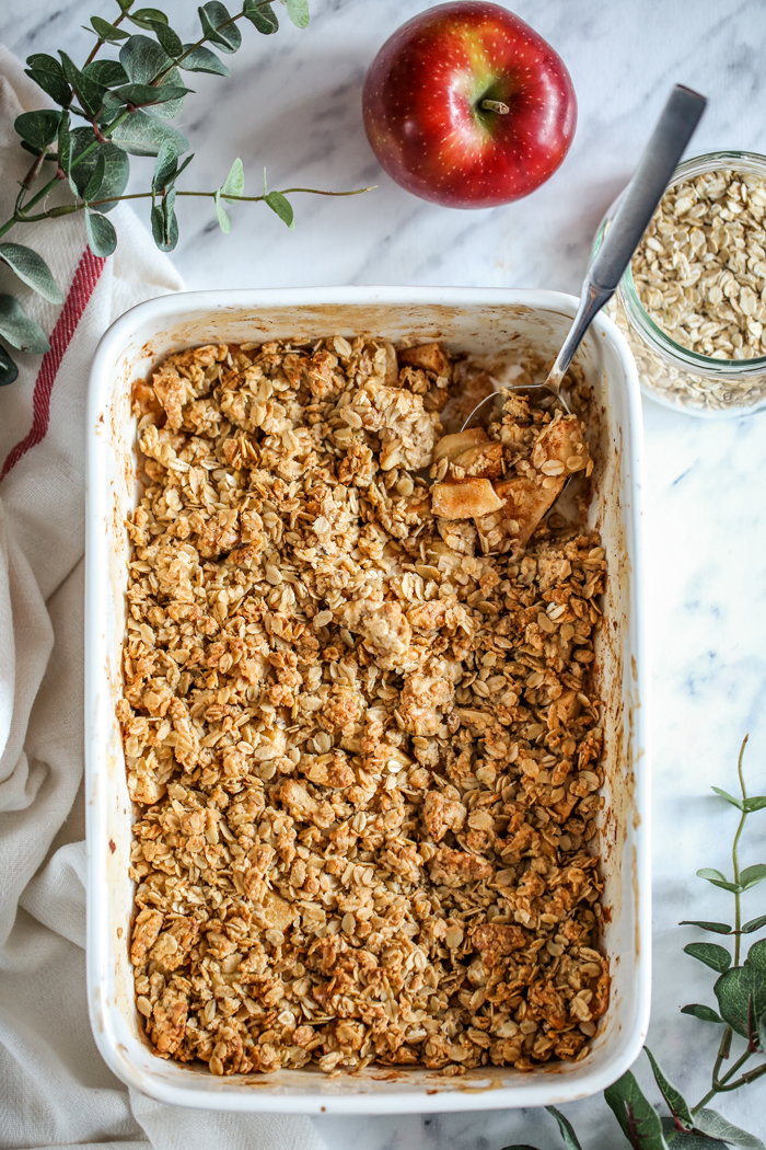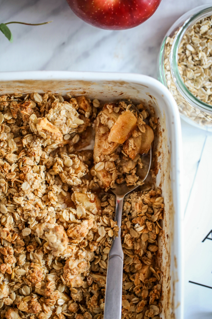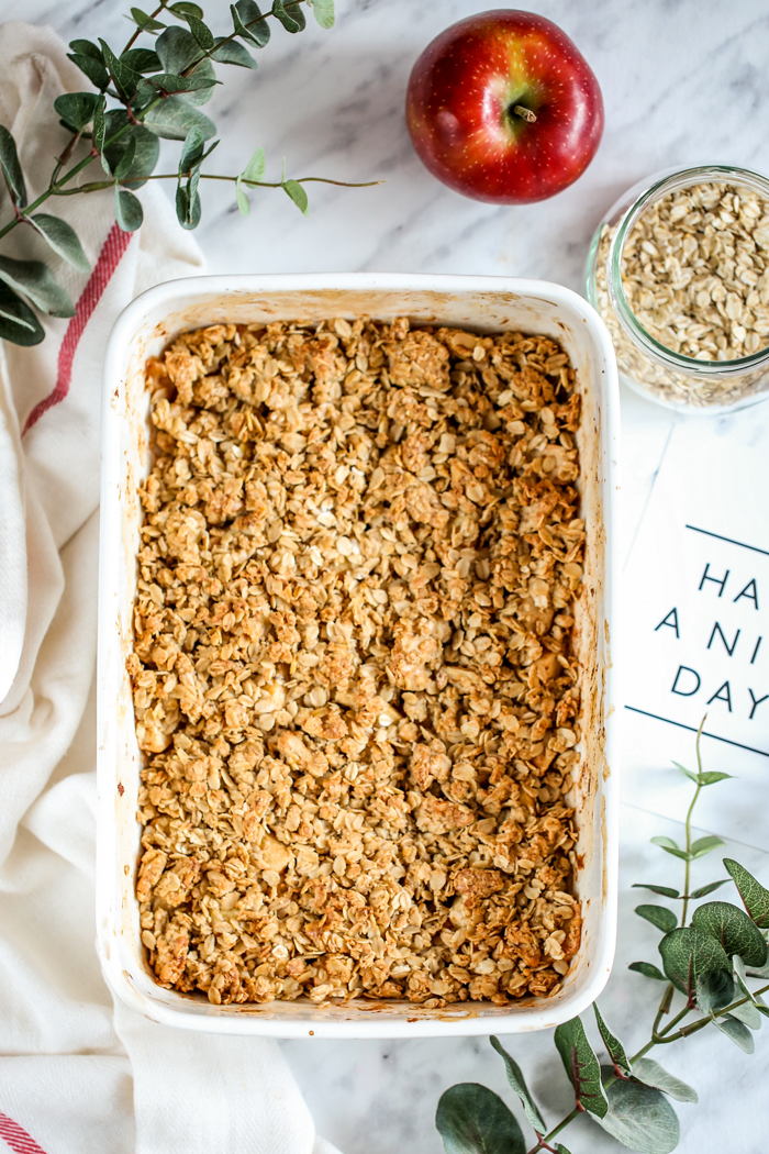 Jabłka obrać, pozbawić gniazd nasiennych, pokroić w większą kostkę. Przełożyć do naczynia żaroodpornego, wymieszać z cynamonem, łyżką syropu klonowego i mąką ziemniaczaną. Przełożyć do piekarnika rozgrzanego do 180 C (termoobieg) i piec przez 10 minut. W oddzielnym naczyniu wymieszać płatki owsiane, orzechy, olej kokosowy, sól i pozostałą łyżkę syropu klonowego. Zmiksować bardzo krótko blenderem, aby rozdrobnić orzechy i część płatków. Dzięki temu całość powinna się lepić i przypominać kruszonkę. Przełożyć równomiernie na podpieczone jabłka i piec kolejne 10-15 minut, do czasu aż całość się zarumieni.