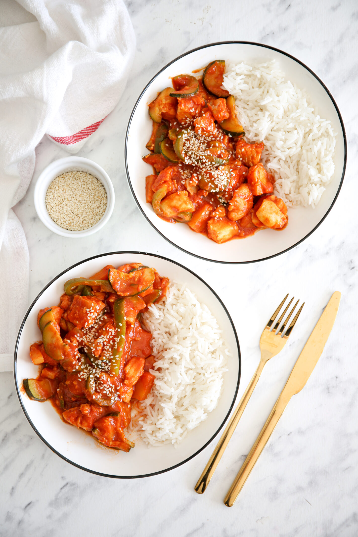 Rybę podzielić na kawałki, ananasa obrać, pokroić na mniejsze kawałki. Paprykę pokroić w paski, cukinię i chili w plasterki. Czosnek przecisnąć przez praskę, imbir zetrzeć na tarce. Na patelni rozgrzać olej, dodać paprykę, smażyć 4 minuty, wrzucić czosnek, chili i imbir. Po minucie dodać cukinię, ananasa, po dwóch minutach, dodać curry. Smażyć chwilę razem, dodać przecier pomidorowy. Zagotować, zmniejszyć płomień, dodać kawałki ryby i gotować pod przykryciem około 10 minut. Podawać z sezamem i ryżem.