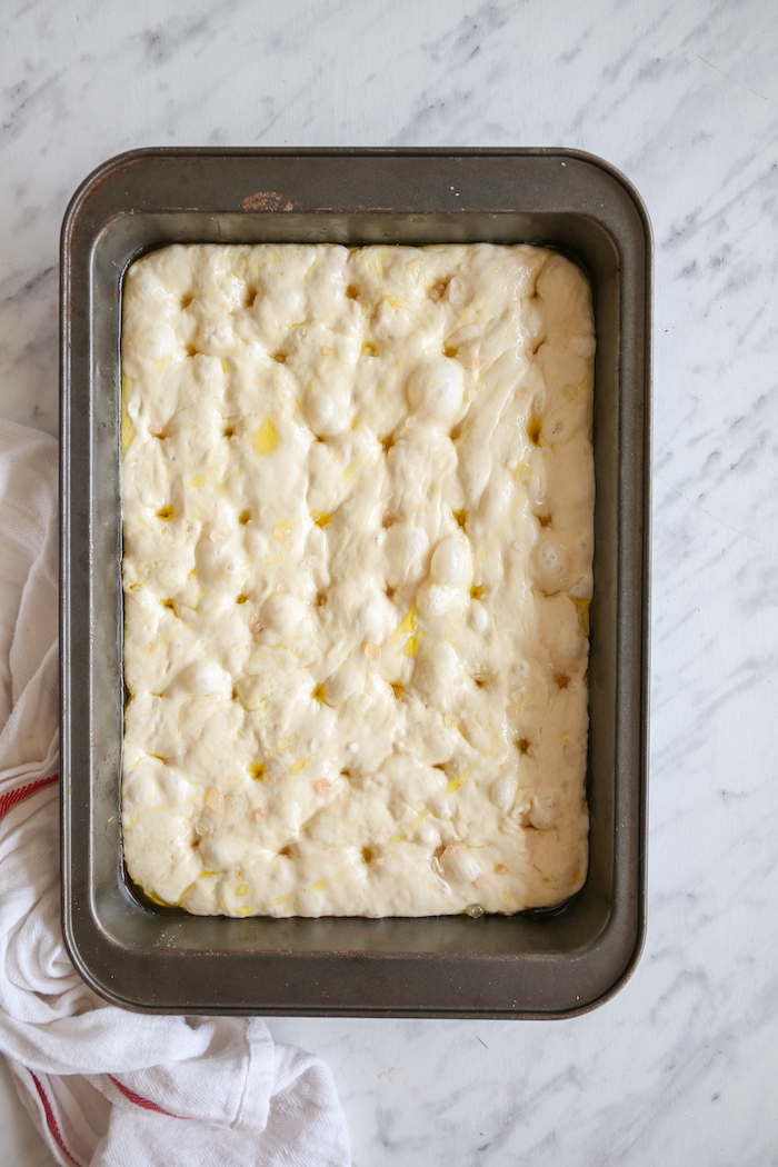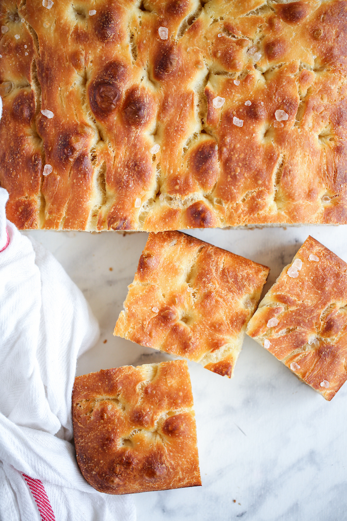 Focaccia – czyli rodzaj włoskiego pieczywa, które możecie zjeść samodzielnie, jako bazę kanapek, czy dodatek do zupy. Bardzo dobrze się mrozi. Odmian jest wiele, nam najbardziej smakuje ta najprostsza, wyłącznie z solą, choć pyszne są również wersje z rozmarynem, suszonymi pomidorami, czy oliwkami. Przepis znalazłam u Marty, która wykorzystuje metodę bez zagniatania z powolną fermentacją. Sprawia ona, że ciasto nabiera odpowiedniej konsystencji i ma pyszną, chrupiącą skórkę. Pomimo niewymagających składników w tym tkwi cały sekret jej niesamowitego smaku : ) Polecam!!!