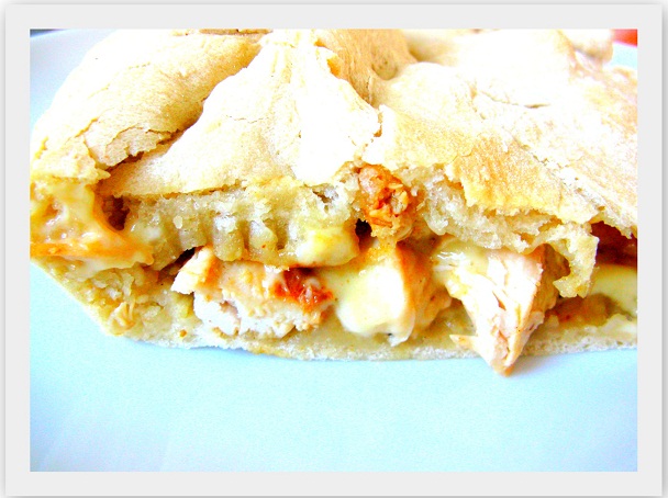 Na przygotowane wcześniej ciasto nakładamy tak przygotowany farsz, dodajemy pokrojoną w plastry mozzarellę i przykrywamy pozostałą częścią ciasta. Wystające krawędzie pierwszego krążka zawijamy do wewnątrz i dobrze zlepiamy. Wierzch ciasta nacinamy nożem.