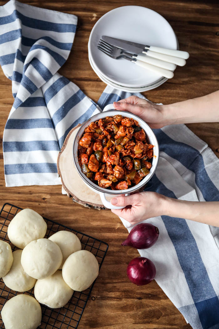 Wlewamy bulion lub wodę i dusimy całość pod przykryciem, aż mięso będzie miękkie – około 90 minut. Dodajemy koncentrat, pokrojone w kostkę ogórki. Opcjonalnie dodajemy odrobinę mąki wymieszanej z wodą, aby zagęścić sos.