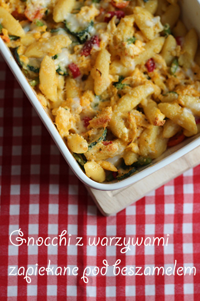 Sos beszamelowy przygotowujemy zgodnie z przepisem na opakowaniu. Połowę sosu wylewamy na dno naczynia żaroodpornego. Mieszankę warzyw podsmażamy na rozgrzanych 2 łyżkach oleju przez 6 minut, a następnie mieszamy razem z gnocchi. Jajka roztrzepujemy i podsmażamy przez kilka minut (tak, aby nie ścięły się całkowicie). Dodajemy je do warzyw wraz z gnocchi i mieszamy. Całość przekładamy do naczynia żaroodpornego i skrapiamy pozostałym sosem. Na koniec dodajemy parmezan, starty na małych oczkach tarki. Przekładamy do rozgrzanego do 200 C piekarnika i zapiekamy przez 15 min.