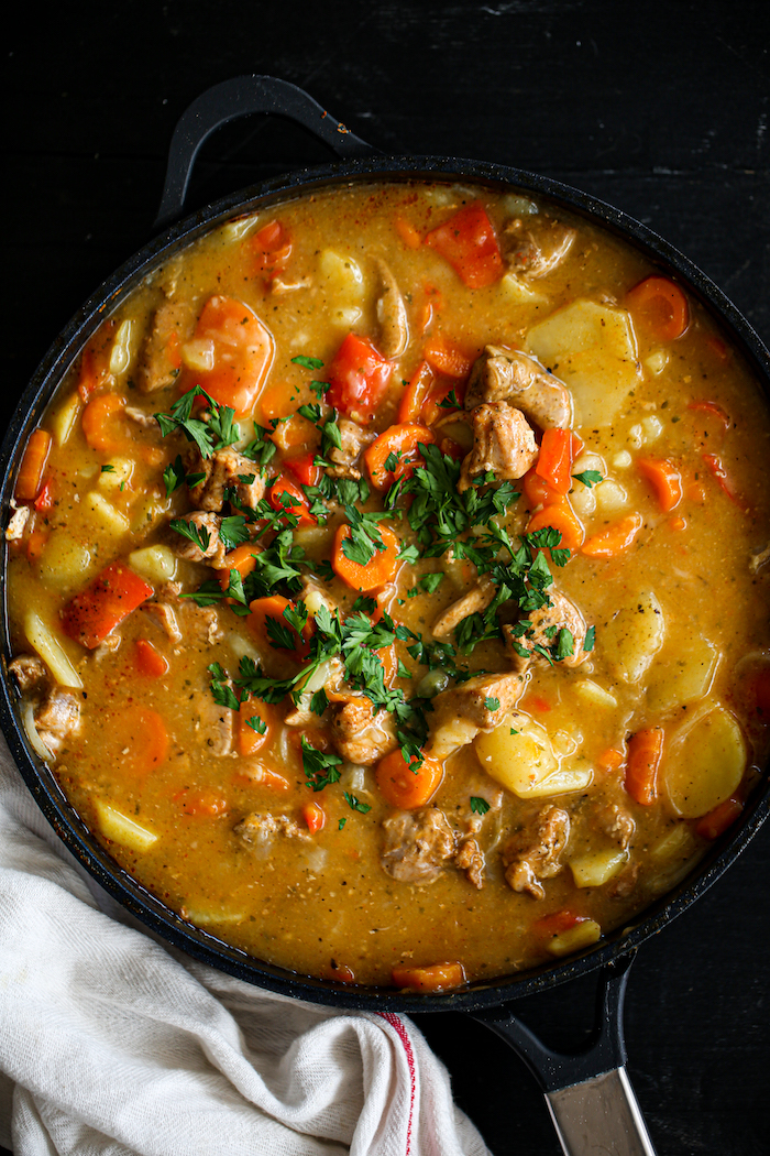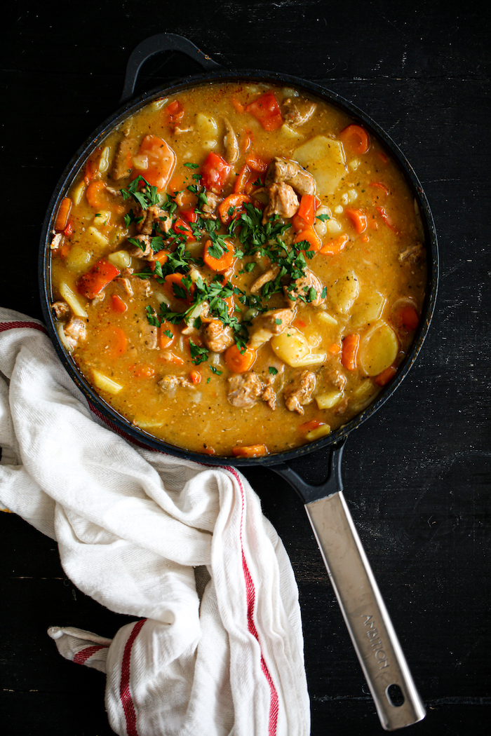 Mięso umyć, pokroić w grubą kostkę. Oprószyć solą i pieprzem, słodką papryką i oregano. Na patelni rozgrzać łyżkę oleju, podsmażyć mięso. Dodać mąkę pszenną, wymieszać. Zalać wodą tak, aby zakryła mięso. Marchewki i ziemniaki pokroić w plastry, paprykę w większą kostkę, cebulę w piórka, czosnek przecisnąć przez praskę. Dodać na patelnię, wymieszać. Przykryć i dusić na małym ogniu przez ok 30 min do miękkości mięsa i warzyw. Doprawić do smaku solą i pieprzem, udekorować natką pietruszki.