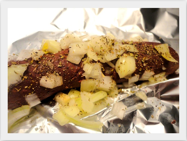 Kaszankę obieramy ze skórki i układamy na kawałku folii aluminiowej. Cebule kroimy w kostkę. Obkładamy nią kaszankę. Całość obficie posypujemy majerankiem i pieprzem. Zawijamy w folię aluminiową i grillujemy.