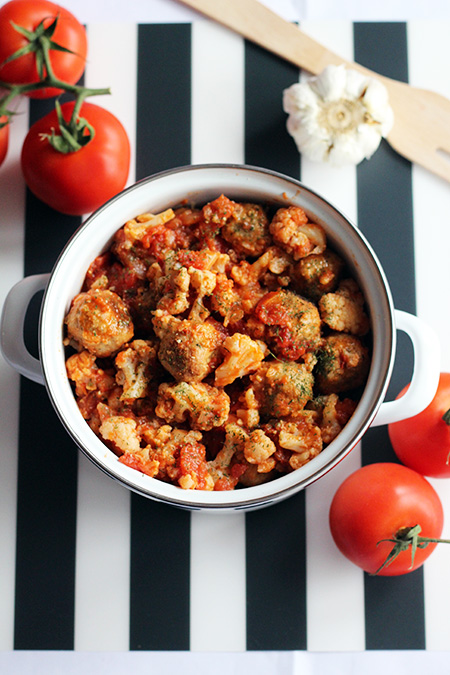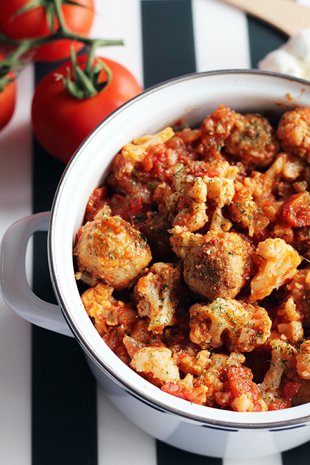 Ostatnio moja Córka zaczęła się trochę buntować i najchętniej obiady jadałaby tylko u Babci… ; ) Domowe nie smakują jej już tak dobrze, więc muszę polegać na sprawdzonych/ulubionych elementach dania np. sosie pomidorowym. Wtedy niezależnie od pozostałych składników jest szansa, że będzie zainteresowana ; ) Jako dodatek wybrałam kalafior oraz małe klopsiki i choć dania tego typu rzadko wyglądają zachęcająco, po spróbowaniu wiele zyskują. Polecam! ; )