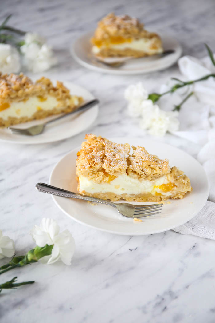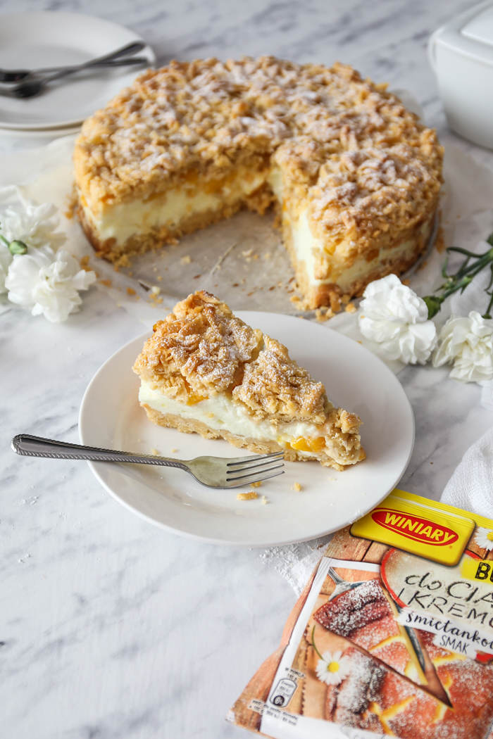 Bardzo chętnie eksperymentuję z nowymi ciastami, ale myśląc już powoli o zbliżających się Świętach, nie mogę się doczekać naszych tradycyjnych wypieków, które obowiązkowo pojawiają się na każdej rodzinnie imprezie i zawsze pierwsze znikają ze stołu ; ) Tak jak obiecałam jeszcze przed Wielkanocą zdradzę Wam kilka ulubieńców, które na pewno Was zainspirują. Kruche ciasto z brzoskwiniami i budyniową pianką to wariacja na temat idealnego kruszona mojej Mamy, a dodatek śmietankowego budyniu do bezowej masy powoduje, że zamienia się ona w pyszną delikatną piankę. Najbardziej lubimy je w wersji z brzoskwiniami lub świeżym agrestem, ale świetnie sprawdzają się również inne owoce, także te mrożone. Jestem pewna, że Wam posmakuje, bo temu ciastu wyjątkowo trudno się oprzeć, a dodatkowo jest bardzo proste i dość szybkie do przygotowania : ) Polecam i zachęcam do wypróbowania!