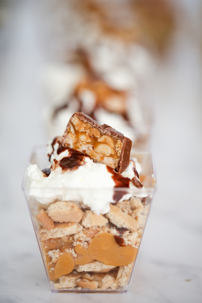 Herbatniki pokruszyć, 1/2 przełożyć na dno pojemników. Masę kajmakową wymieszać dokładnie z mlekiem i orzeszkami, przełożyć na herbatniki. Na kajmakowy krem dodać kolejną warstwę herbatników. Kremówkę zmiksować z cukrem pudrem i serkiem mascarpone na gęsty krem. Ułożyć na herbatnikach. Udekorować czekoladą roztopioną z 50 ml kremówki i pokrojonym batonem snickers. Przechowywać w lodówce.