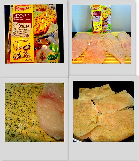 Pomysł polega na wykorzystaniu pergaminu do smażenia (bez dodatku tłuszczu!!!), na którym znajdują się zioła i przyprawy. Naszym zadaniem jest tylko przekrojenie piersi z kurczaka, delikatne ich rozbicie i umieszczenie na patelni! Patent jest naprawdę super, przygotowanie obiadu, łącznie ze smażeniem trwa 15 minut, nie musimy nawet „brudzić” sobie rąk : ) Do wyboru mamy 3 smaki: soczysta pierś z kurczaka z papryką (mój faworyt!), soczysta pierś z kurczaka z czosnkiem i ziołami, soczysta pierś z kurczaka w ziołach prowansalskich. Kompozycja ziół i przypraw jest naprawdę fajnie dobrana, ich smak mocno dominuje, a nazwa soczysta pierś jest mocno trafiona – polecam : )
