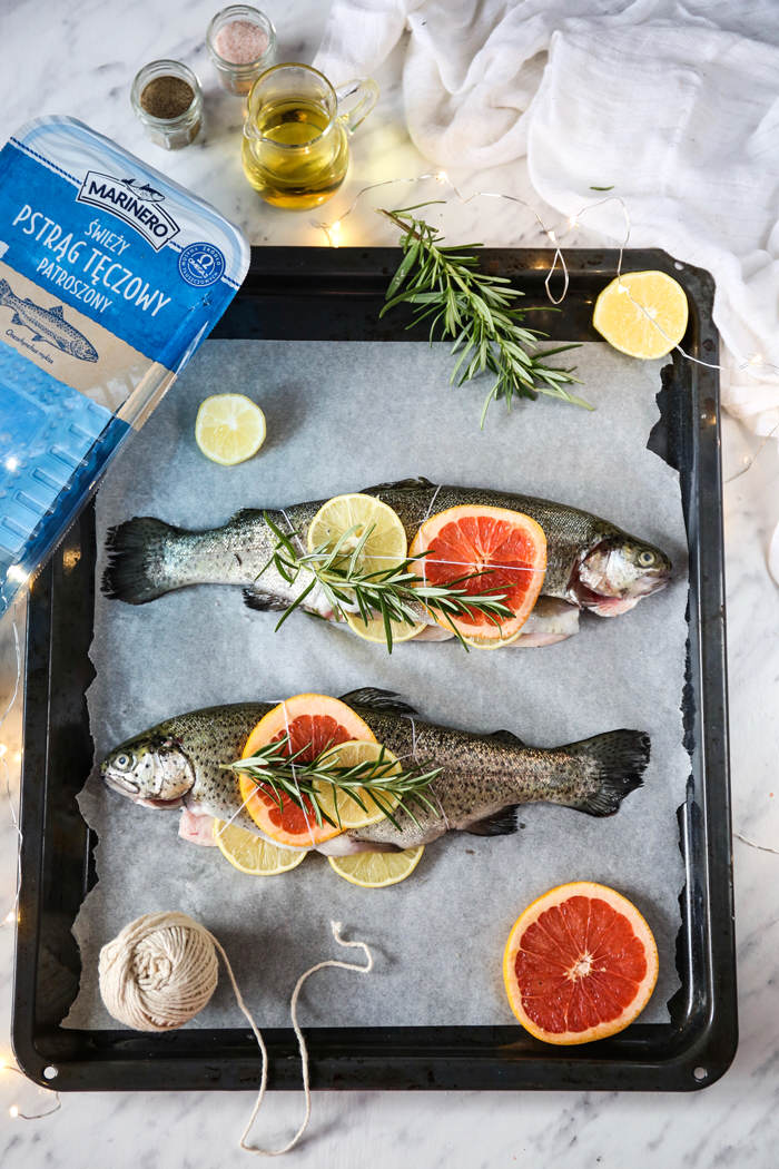Pstrągi opłukać wodą, osuszyć papierowym ręcznikiem. Wnętrze każdej ryby wysmarować olejem, skropić sokiem z cytryny i grejpfruta, doprawić do smaku solą i pieprzem. Do środka ryby włożyć po dwa plasterki cytryny. Na wierzchu ułożyć plasterek cytryny oraz grejpfruta i gałązkę rozmarynu. Całość można związać nitką, aby lepiej się trzymała. Piec w piekarniku rozgrzanym do 200 C (termoobieg) przez 20 minut.