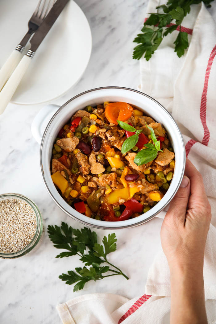 Uwielbiam meksykańskie dania, zwłaszcza te jednogarnkowe : ) Przygotowuję je zawsze w dużej ilości, a odgrzewane kolejnego dnia smakują jeszcze lepiej! Tym razem zamiast naszego ulubionego gulaszu przygotowałam schab po meksykańsku i ta wersja jest równie pyszna. W większości użyłam warzyw mrożonych, ale latem lepiej wykorzystać sezonowe. Polecam!!!