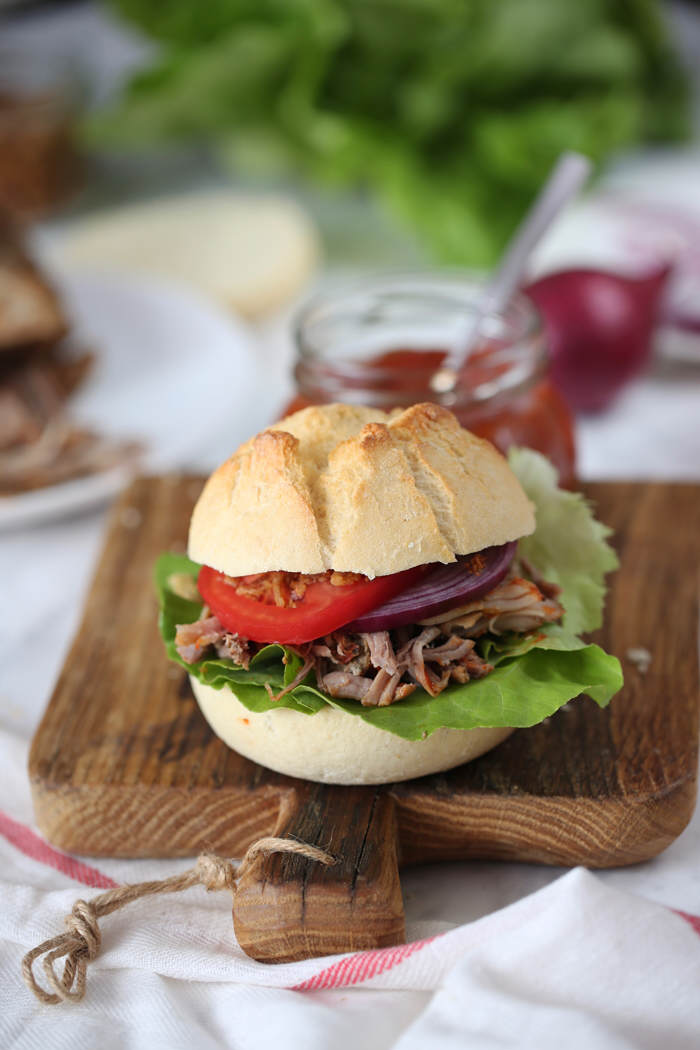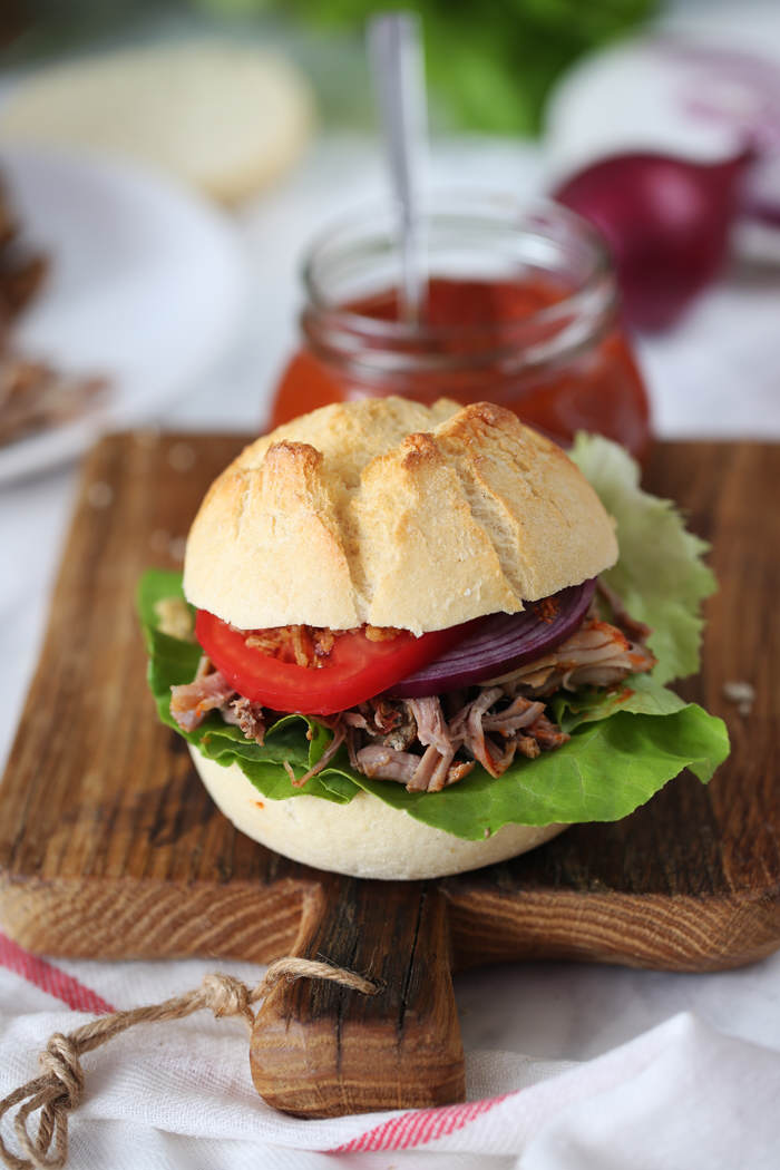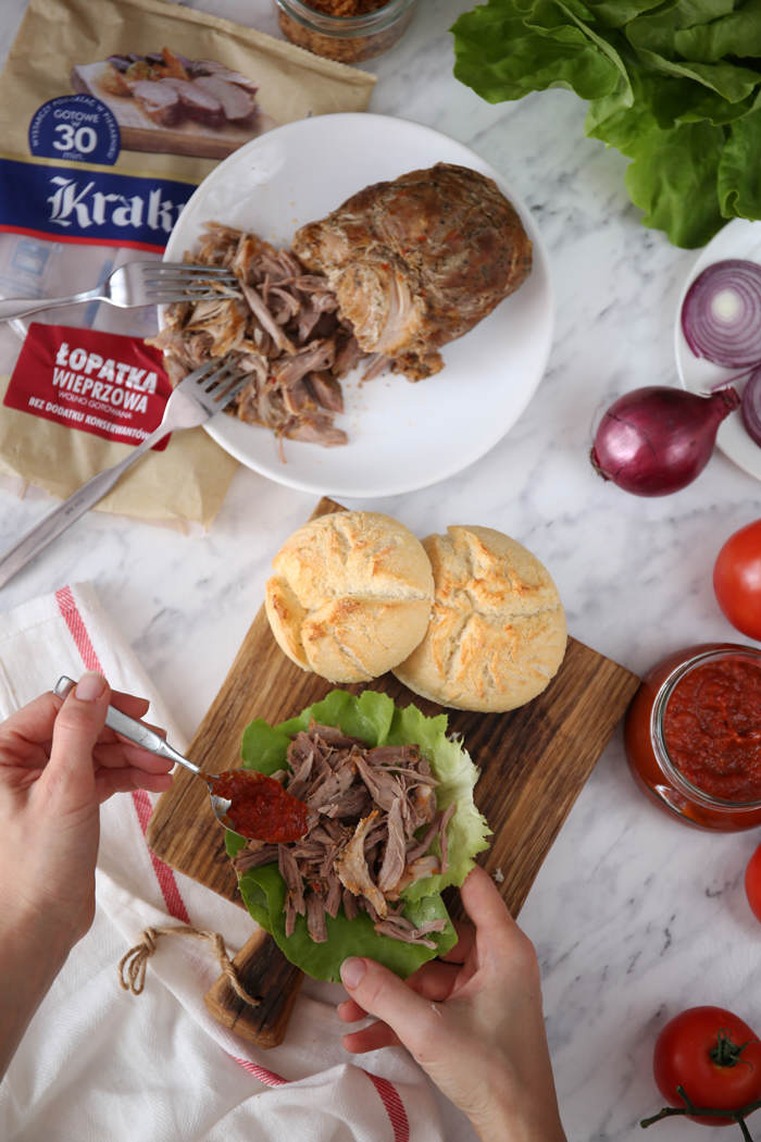 Łopatkę wyjąć z opakowania i piec 30 minut w piekarniku (szczegółowa instrukcja na opakowaniu), a następnie przy pomocy widelca rozdzielić ją – poszarpać na cienkie paski. Bułki przekroić na dwie części, usunąć miąższ, podgrzać w piekarniku. Dolną część posmarować cienką warstwą sosu BBQ, wyłożyć plaster sałaty, szarpaną wieprzowinę, kolejną warstwę sosu, plastry czerwonej cebuli i pomidora. Bekon pokroić w cienkie paseczki, podsmażyć na suchej patelni do czasu aż będzie chrupiący. Wymieszać z prażoną cebulą i posypać na warzywa. Przykryć drugą częścią bułki. Podawać od razu.
