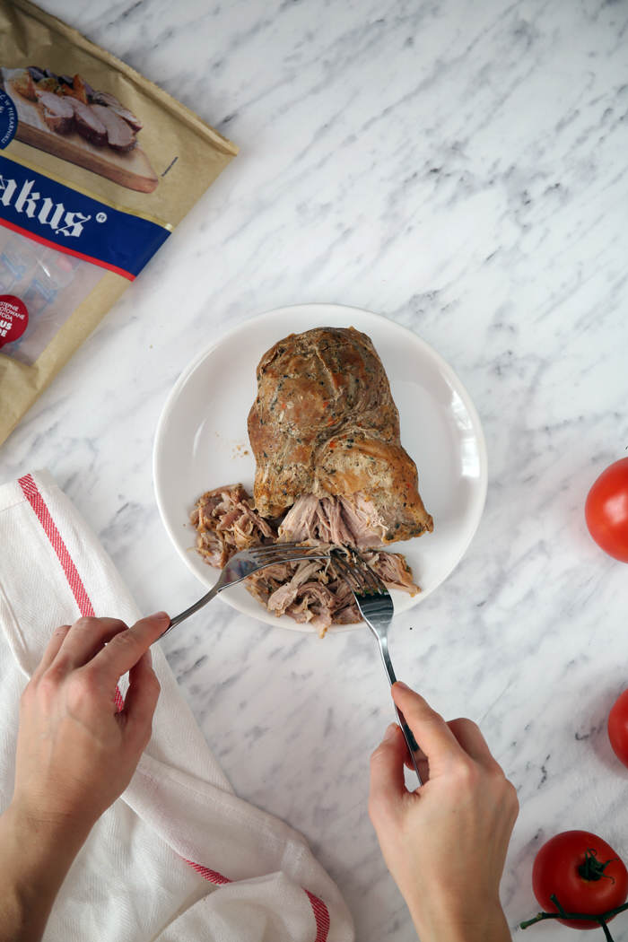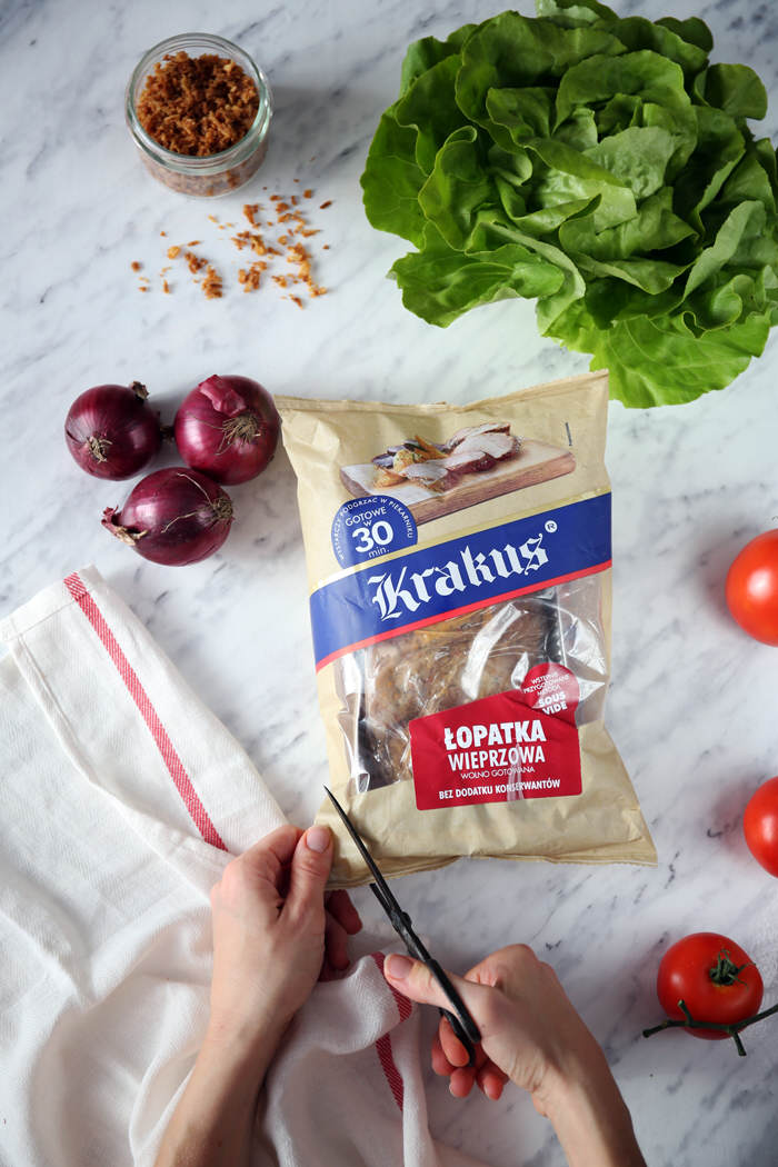 Szarpana wieprzowina, czyli amerykański pulled pork to rodzaj długo pieczonego mięsa w niskiej temperaturze. Jego przygotowanie jest przez to dość rozciągnięte w czasie, ale w efekcie otrzymujemy rozpływające się w ustach, aromatyczne danie. Nie zawsze możemy sobie jednak pozwolić na długie marynowanie, a potem całonocne pieczenie i wtedy warto wypróbować jeden z nowych produktów Krakus – łopatkę wieprzową przygotowaną metodą sous vide. Wystarczy ją podgrzać 30 minut w piekarniku a otrzymujemy soczyste, wyraziste mięso. W połączeniu z sosem barbecue, bekonem i warzywami danie nabiera wielowymiarowego smaku i całość na pewno pysznie Was zaskoczy. Polecam!!!