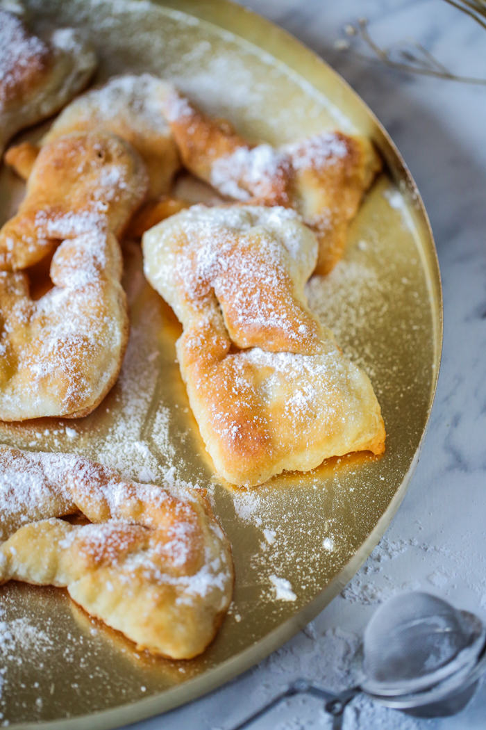 *Uwaga! Z podanych składników wychodzi sporo faworków, które są bardzo syte, więc połowę ciasta wykorzystałam kolejnego dnia na placuszki, smażąc je już bez dodatku tłuszczu na mocno rozgrzanej teflonowej patelni.
