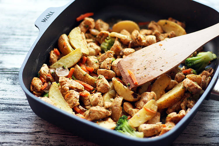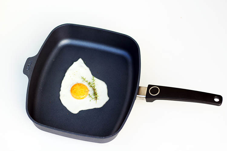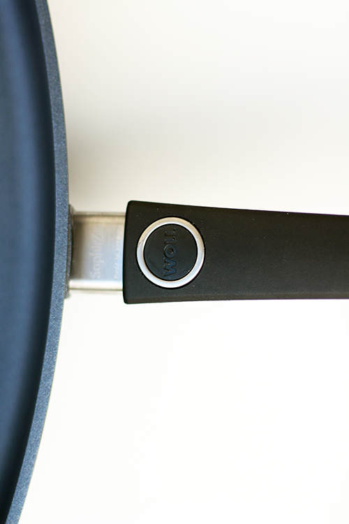 Rączka patelni nie nagrzewa się podczas smażenia. Pomimo, że patelnia dobrze leży w dłoni na początku wydawała mi się dość ciężka, ale dzięki temu jest również bardzo stabilna i nie ma problemu z jej przesuwaniem się po płycie np. podczas mieszania potrawy, kiedy do dyspozycji mamy tylko jedną rękę.
