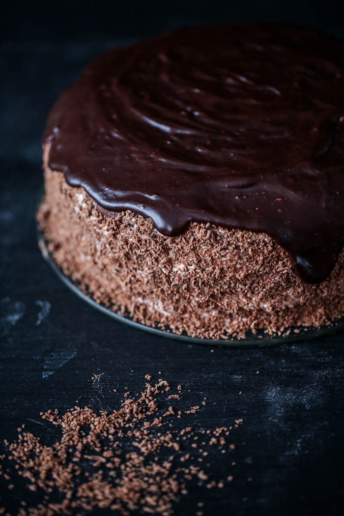 Pierwszy blat wyłożyć na paterze, nasączyć 50 ml kawy, przełożyć połową powideł i połową śmietankowego kremu. Przykryć kolejnym blatem i całość powtórzyć. Przykryć ostatnim blatem, nasączyć pozostałą częścią kawy. Boki tortu udekorować pozostawionymi 5 łyżkami śmietankowego kremu i oprószyć czekoladą startą na małych oczkach tarki. Na górę wylać zastygającą polewę czekoladową. Schłodzić w lodówce.