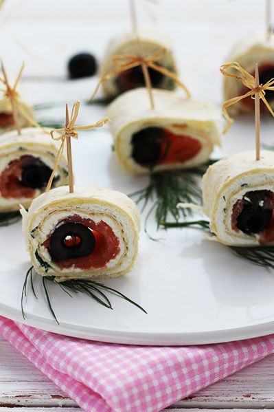 Tortille smarujemy twarogiem, posypujemy posiekanym koperkiem i świeżo mielonym pieprzem. Na twarogu układamy kawałki wędzonego łososia oraz jeden rząd czarnych oliwek. Zwijamy tortille w rulon i przecinamy w kilkucentymetrowe kawałki.