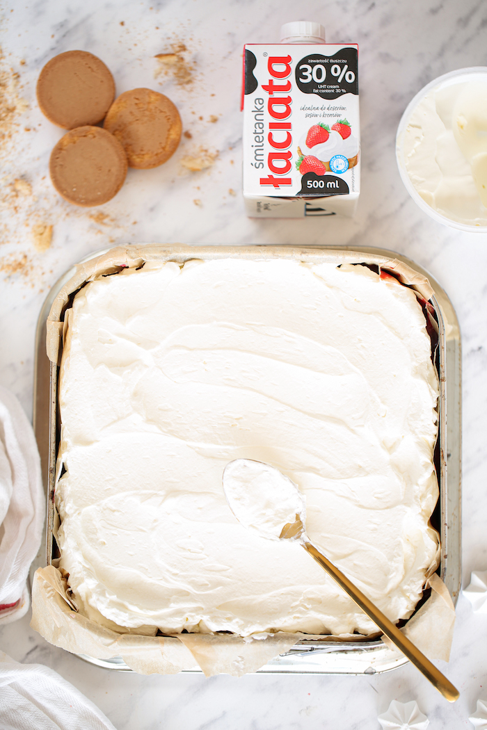 Truskawkowa pokusa to przepyszne, lekkie ciasto bez pieczenia, z którego przygotowaniem poradzi sobie każdy. Ciasto pięknie się prezentuje i super sprawdzi się na letnich imprezach i rodzinnych uroczystościach. Do jego przygotowania wykorzystałam niezawodną śmietankę Łaciata 30%, która się nie rozwarstwia, więc jest idealna do ubijania. Dodatkowo ma długi termin przydatności do spożycia, dzięki czemu zawsze mam ją w domowych zapasach. Pamiętajcie, aby przed ubijaniem koniecznie słodzić ją w lodówce przez co najmniej 12 godzin, to gwarancja sukcesu.
